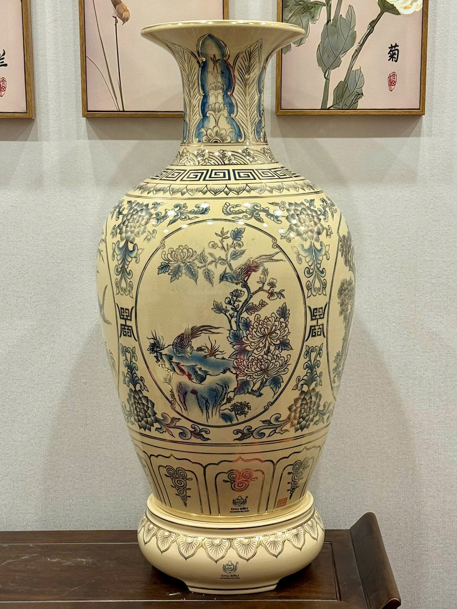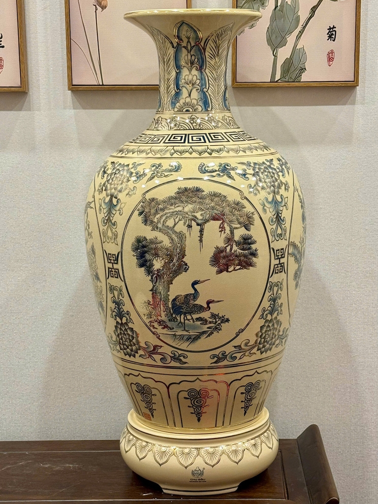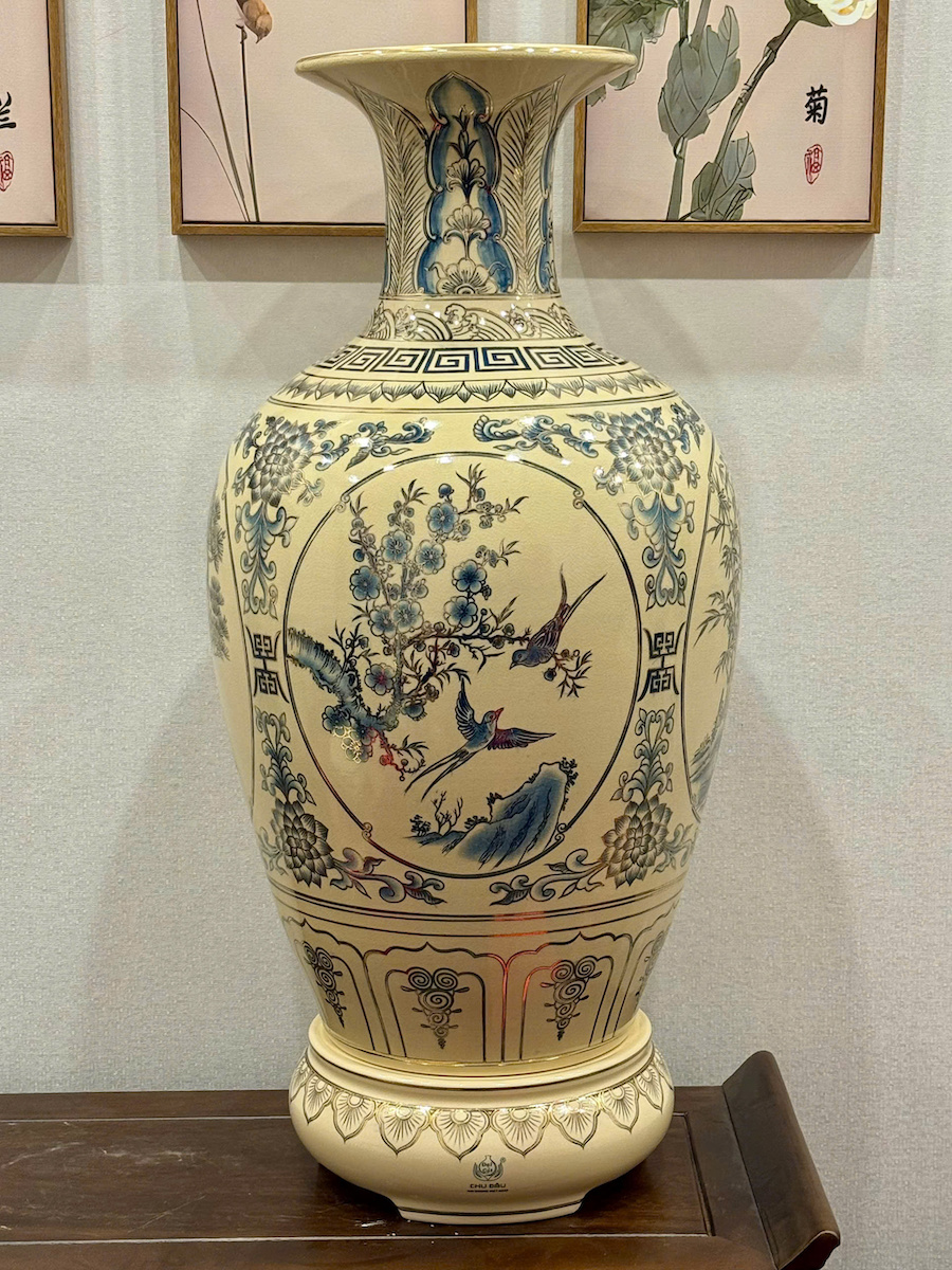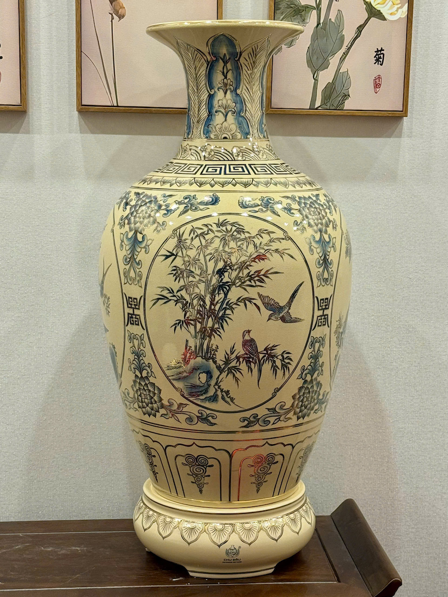 Bảo Bình Tứ Cảnh Xanh Coban Cao 95cm Gốm Chu Đậu Vẽ Vàng