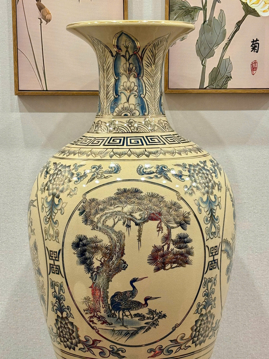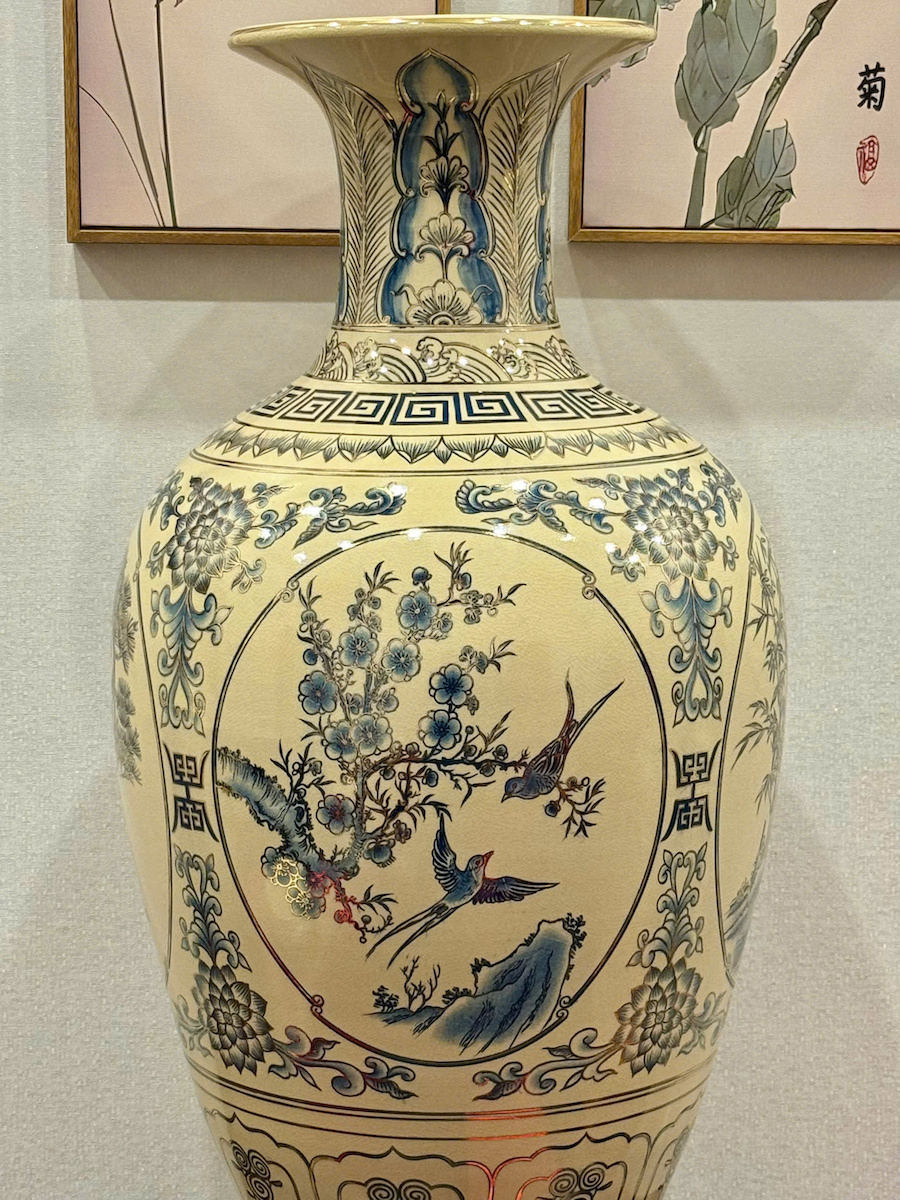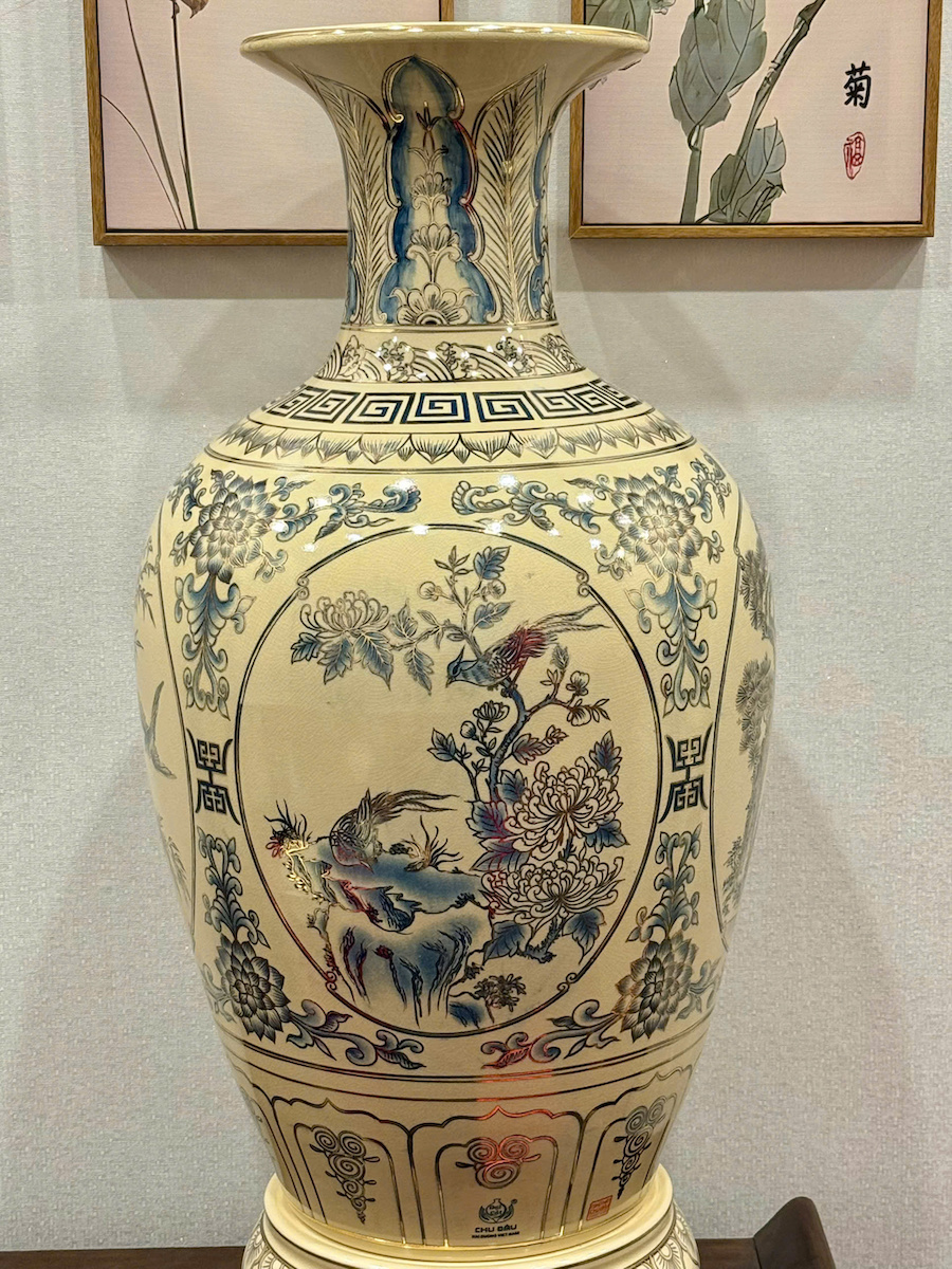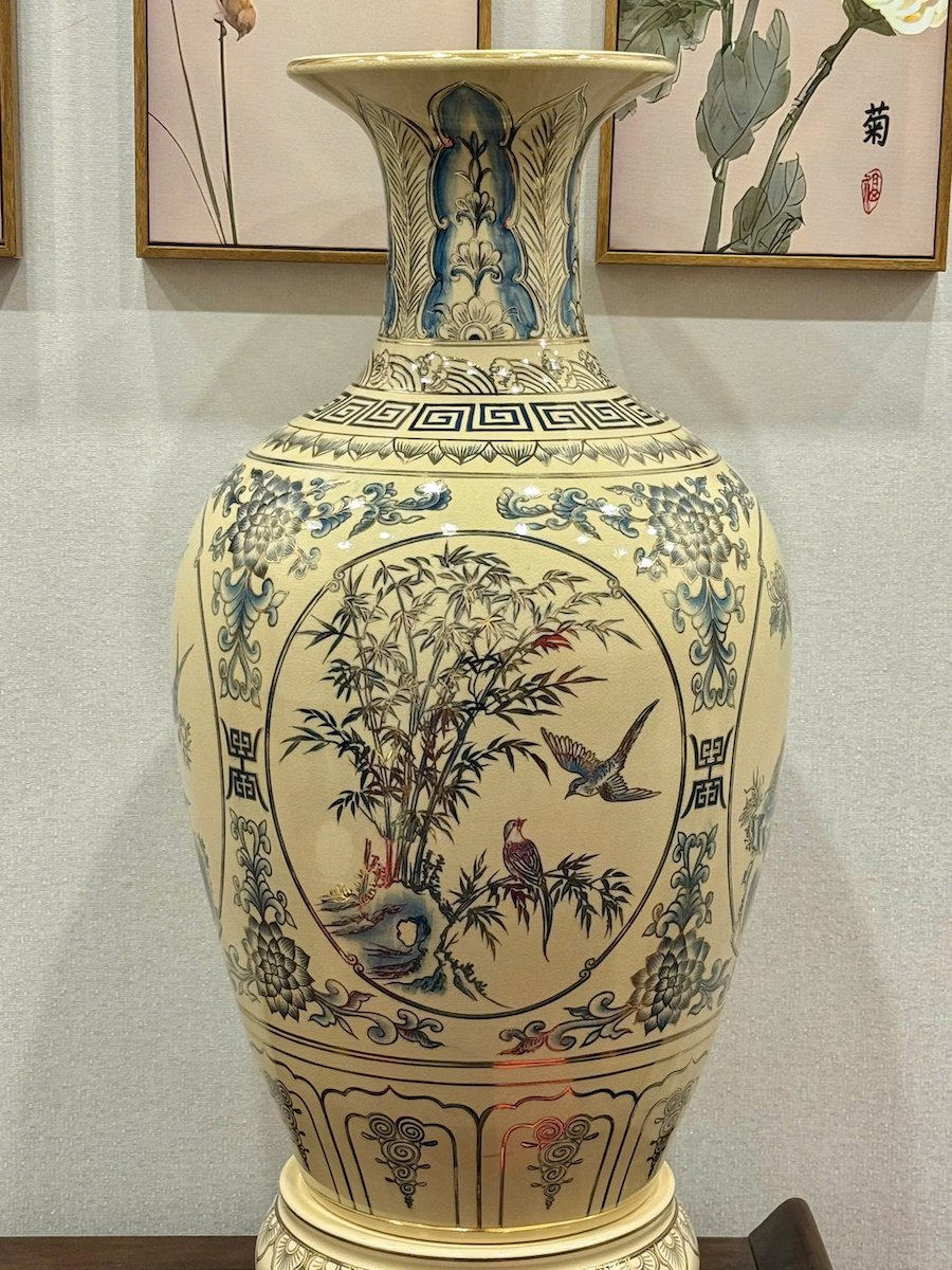 Bảo Bình Tứ Cảnh Xanh Coban Cao 95cm Gốm Chu Đậu Vẽ Vàng