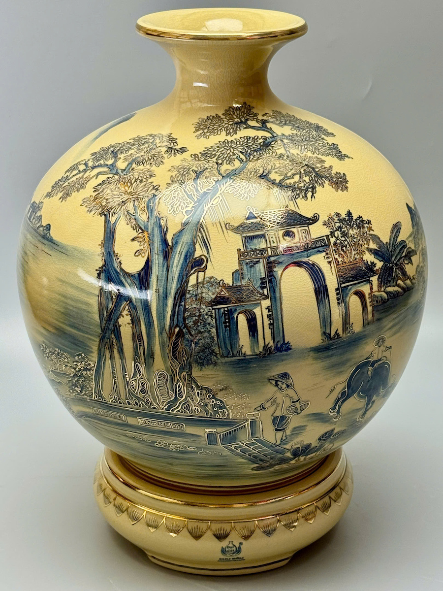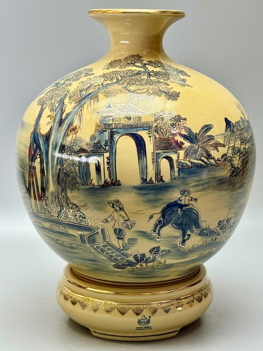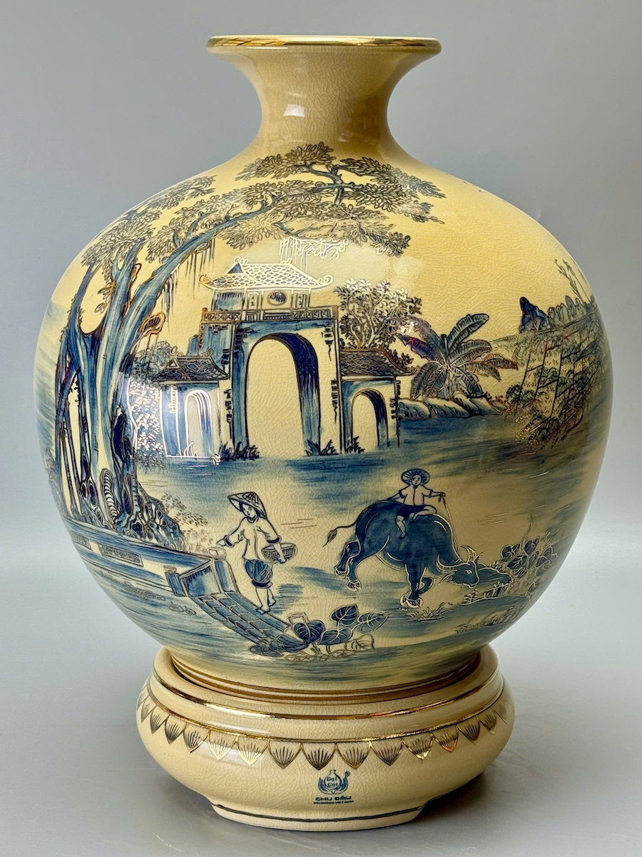 Bình HL Cảnh Làng Quê Việt Nam Màu Xanh Coban Cao 42cm Gốm Vẽ Vàng