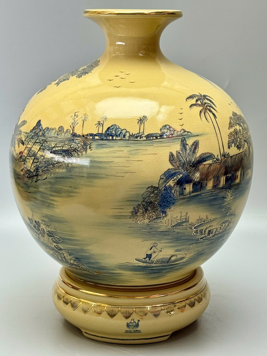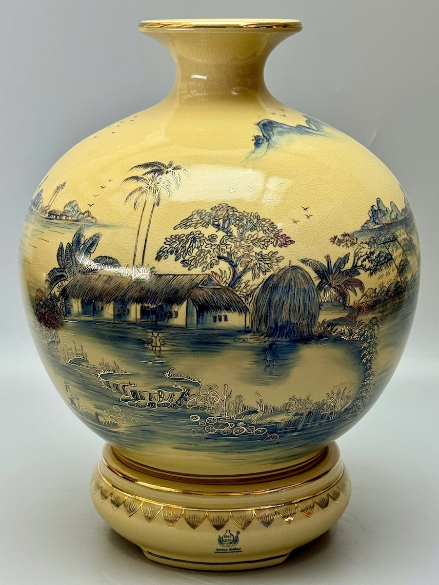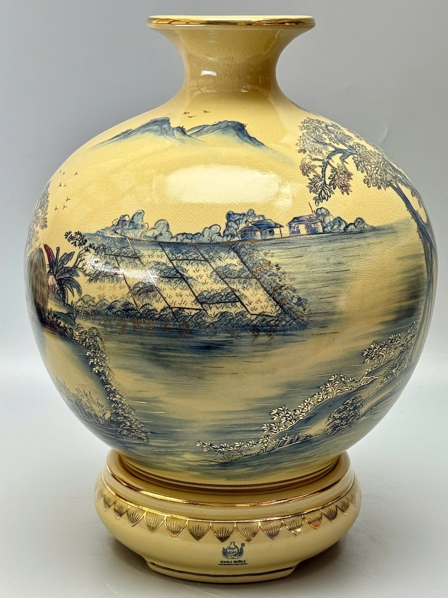 Bình HL Cảnh Làng Quê Việt Nam Màu Xanh Coban Cao 42cm Gốm Vẽ Vàng