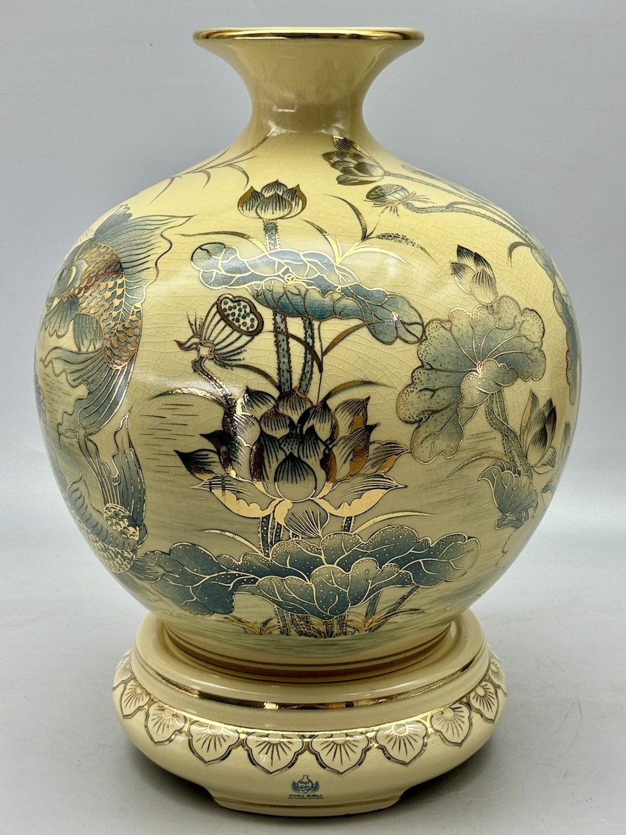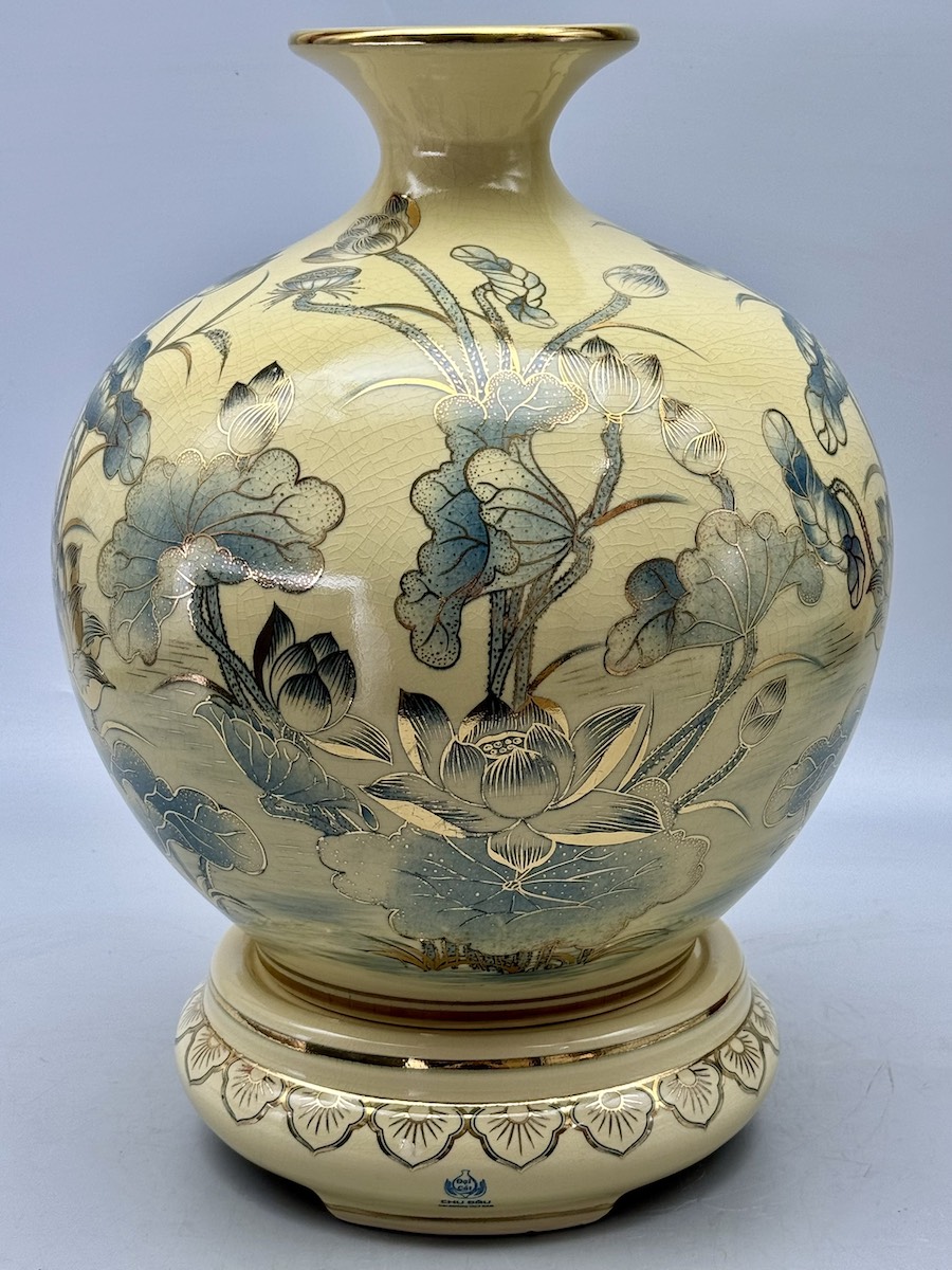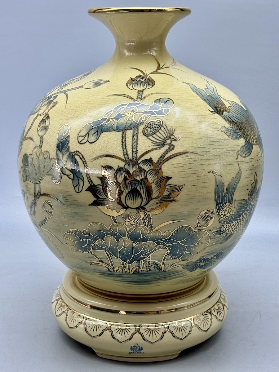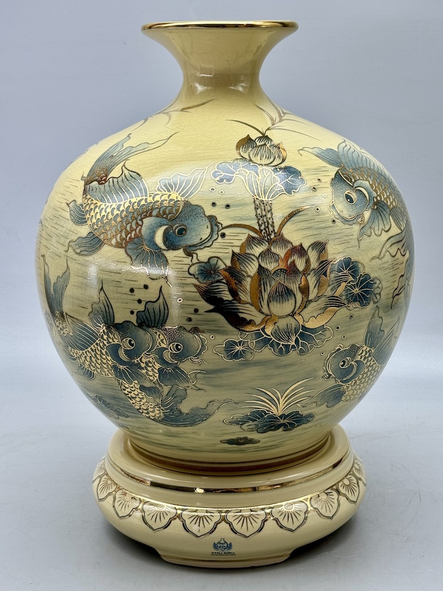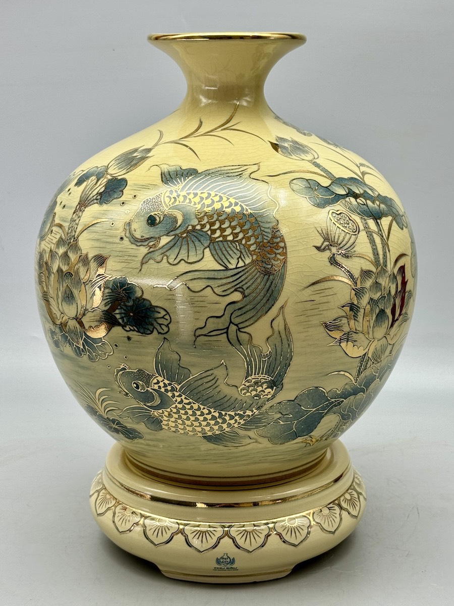 Bình Hút Lộc Cá Chép Hoa Sen H35 Gốm Chu Đậu Vẽ Vàng
