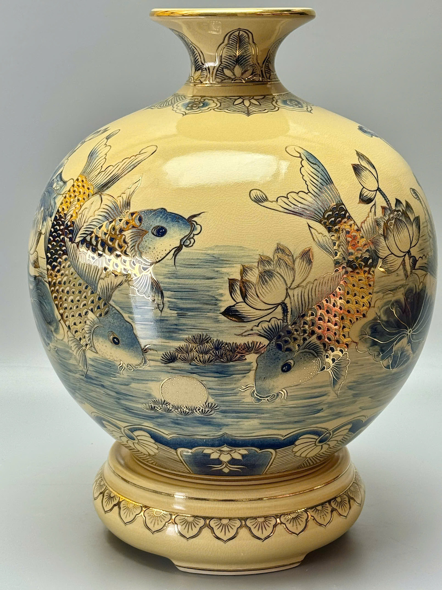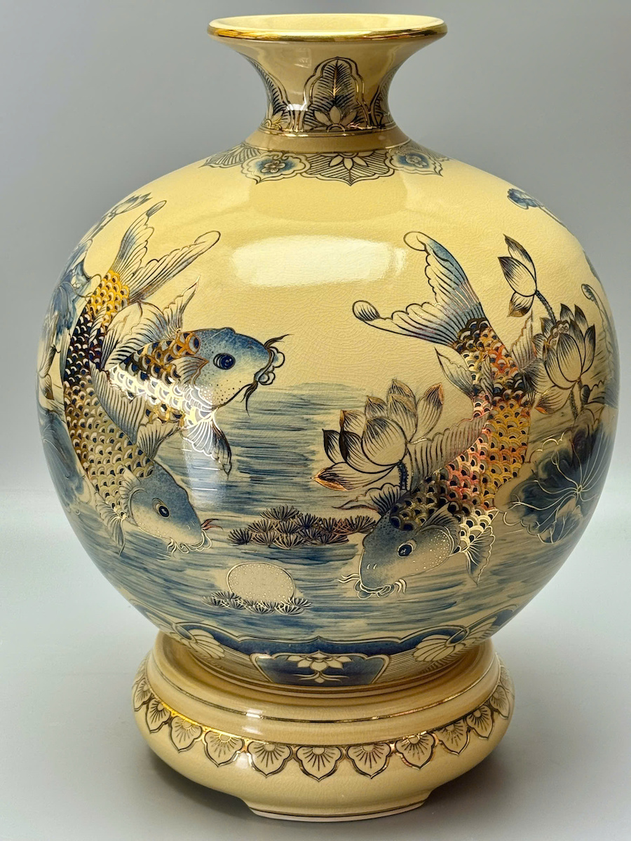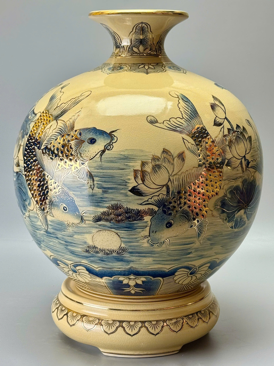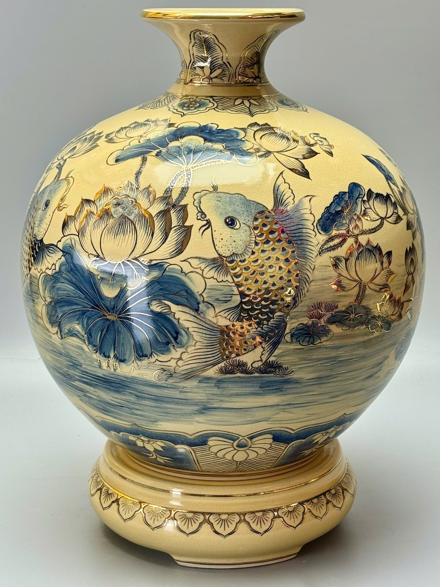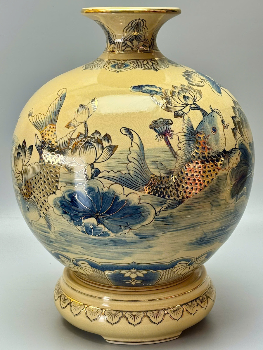 Bình Hút Lộc Cửu Ngư Hoa Sen Xanh Coban Cao 42cm Gốm Vẽ Vàng