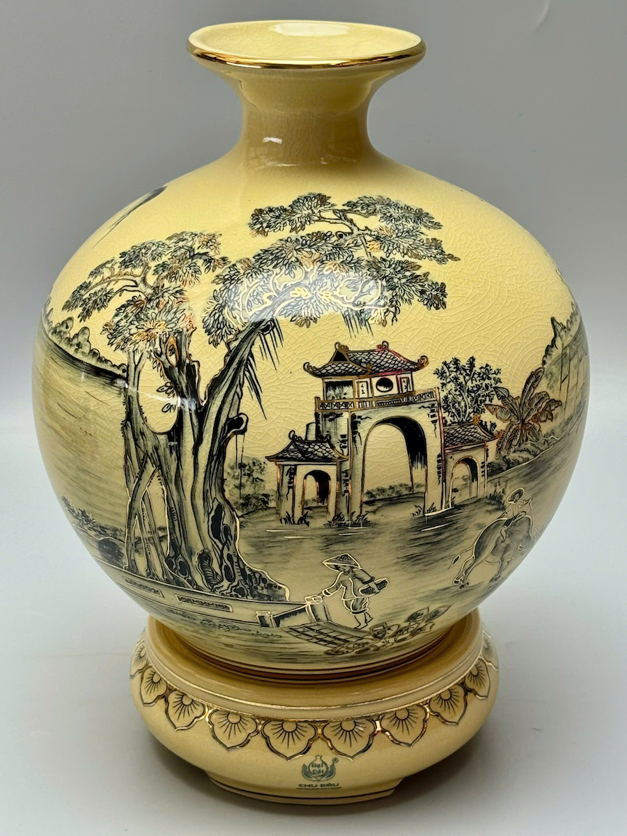 Bình Hút Lộc Hoạ Tiết Làng Quê Cao 36cm Gốm Vẽ Vàng Thoáng