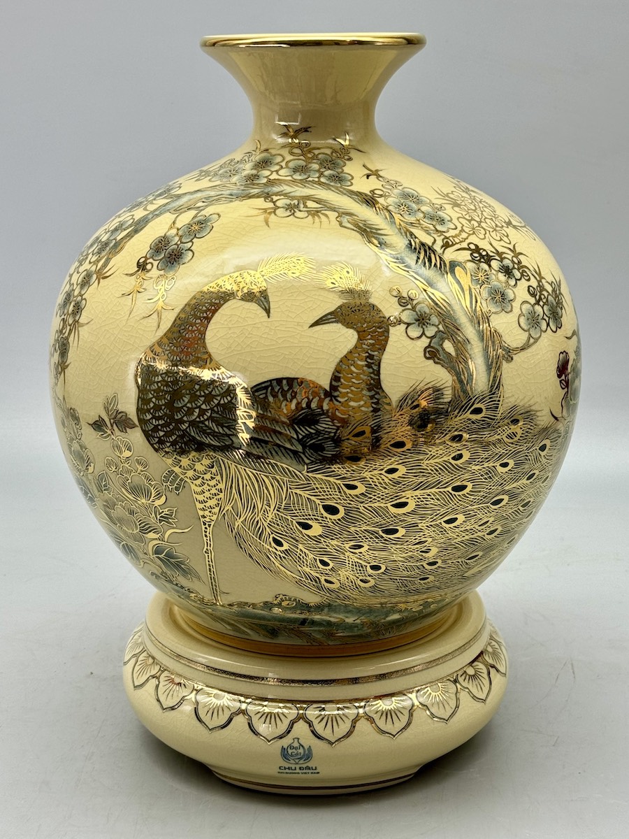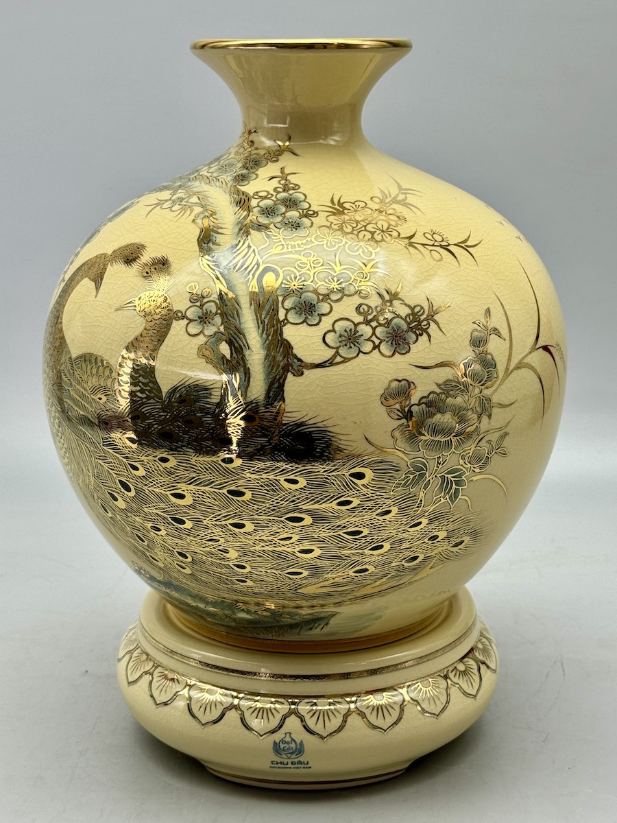 - Bên cạnh hoa đào, chim công đại diện cho phú quý, tài lộc và quyền quý. Về phong thủy, với sự kết hợp của chim công và hoa mẫu đơn, tượng trưng cho sự thịnh vượng, giàu có, vương giả cũng như sắc đẹp. Bình hút lộc phu thê viên mãn H30 gốm Chu Đậu vẽ vàng kim sẽ đem lại nguồn sinh khí mới cho công danh, sự nghiệp của mỗi người, cho sắc đẹp viên mãn của hạnh phúc lứa đôi. Sản phẩm gốm sứ cảnh chim công và hoa đào mang lại vẻ đẹp thẩm mỹ cho ngôi nhà mà nó còn xua tai đi mọi luồng khí xấu, mang lại vượng khí, hạnh phúc, tiền tài cho gia chủ.
