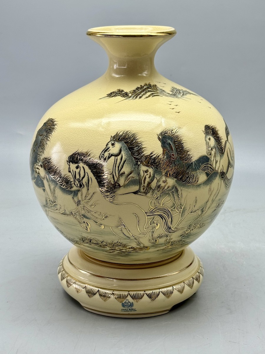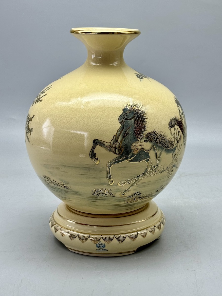 - Bình hút lộc gốm Chu Đậu Mã Đáo Thành Công Vẽ Vàng 24K là một trong những kiệt tác nghệ thuật gốm sứ men rạn của làng gốm Chu Đậu (tỉnh Hải Dương). Tính tới thời điểm hiện tại, gốm Chu Đậu có mặt trên 32 quốc gia và được mệnh danh là “tinh hoa” của gốm sứ cổ thế giới.