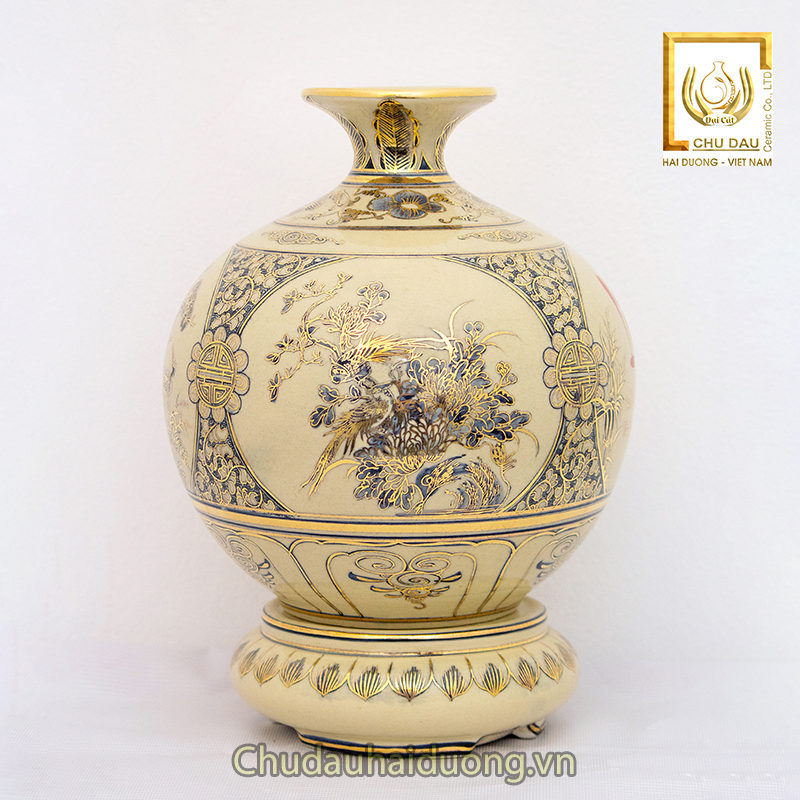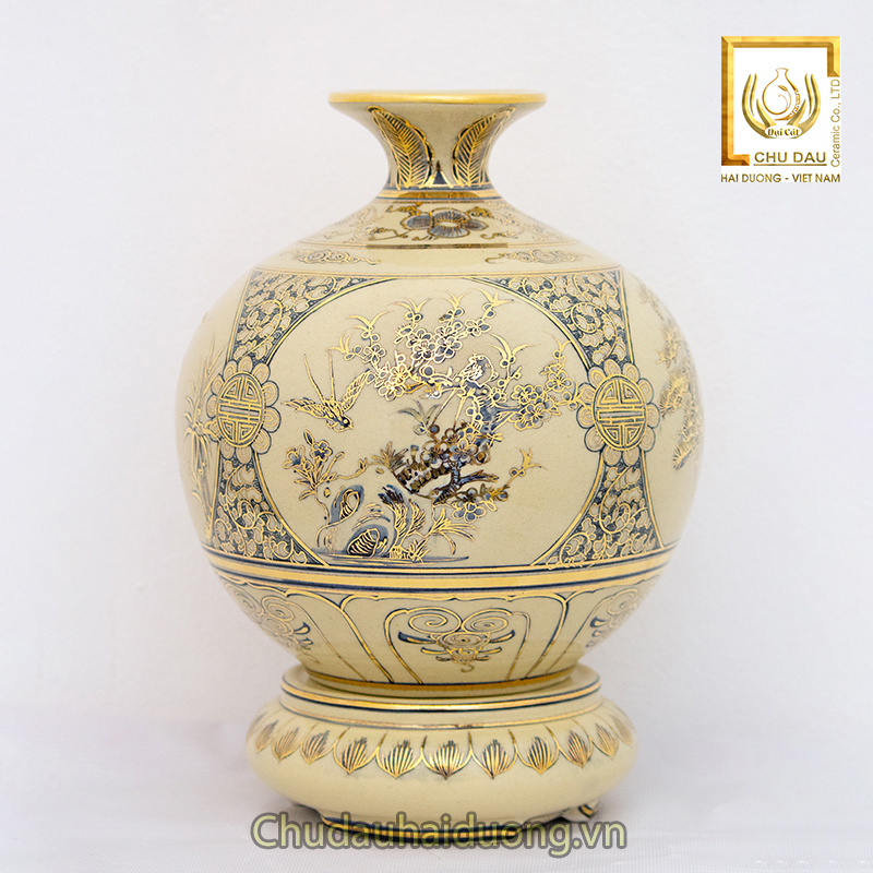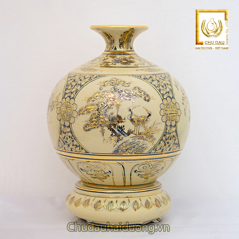 - Chất liệu: Gốm sứ men rạn vẽ vàng nguyên chất 24k được sản xuất trực tiếp tại làng gốm Chu Đậu – một trong những thương hiệu gốm sứ được 32 quốc gia trên thế giới công nhận về đỉnh cao nghệ thuật.