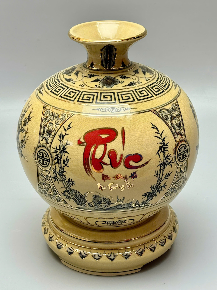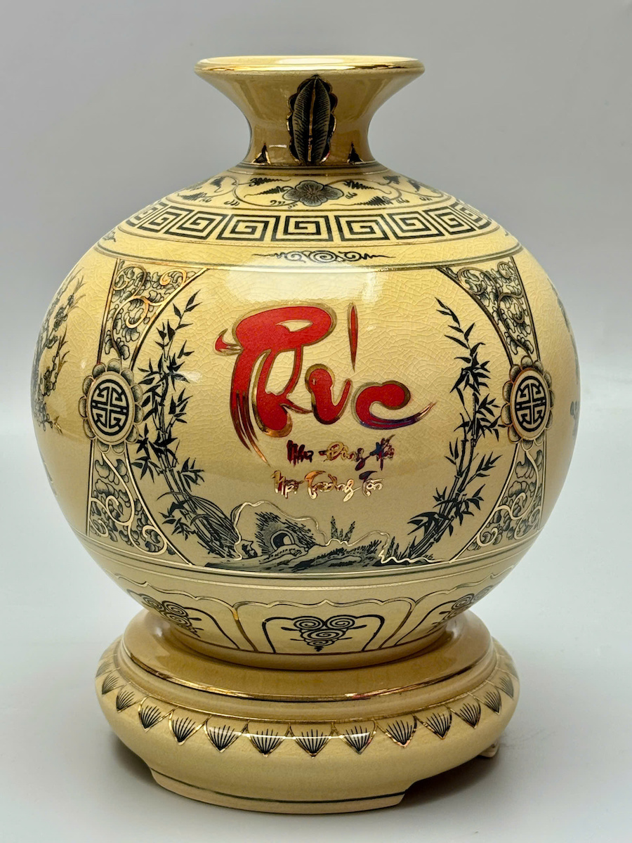 Bình Hút Lộc Tứ Cảnh Chữ Phúc Cao 28cm Gốm Vẽ Vàng Thoáng