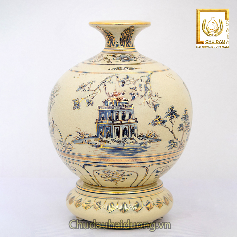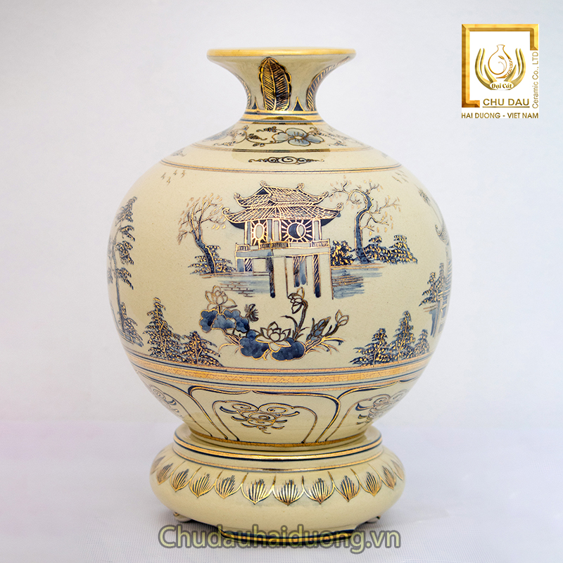 - Ngoài nét mực họa lên những bức tranh thiên nhiên tuyệt sắc, các nghệ nhân còn sử dụng vàng 24k nguyên chất tô điểm trên từng chi tiết. Chính sự sang trọng đẳng cấp này là chi tiết đắt giá nhất tôn vinh chất nghệ thuật đỉnh cao của bình gốm Chu Đậu.