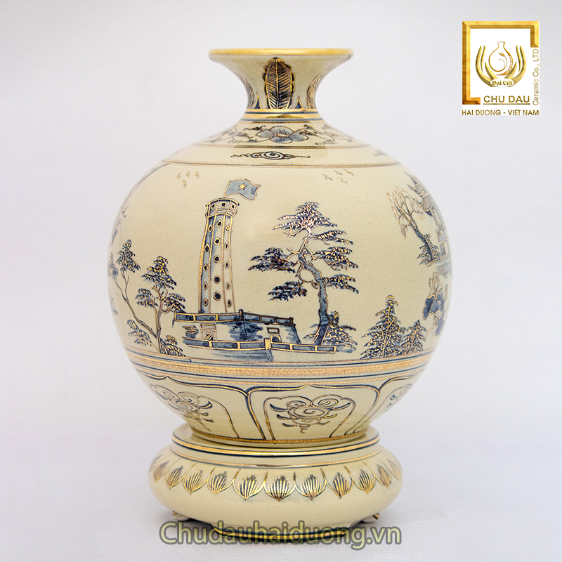 Bình Hút Lộc Tứ Cảnh Hà Nội H25 Gốm Chu Đậu Vẽ Vàng 24K RG-000575