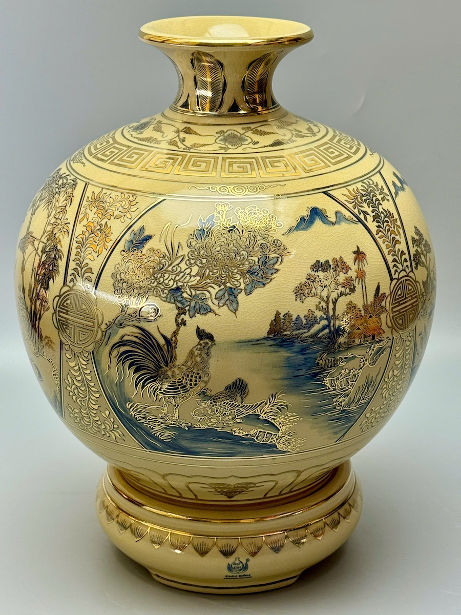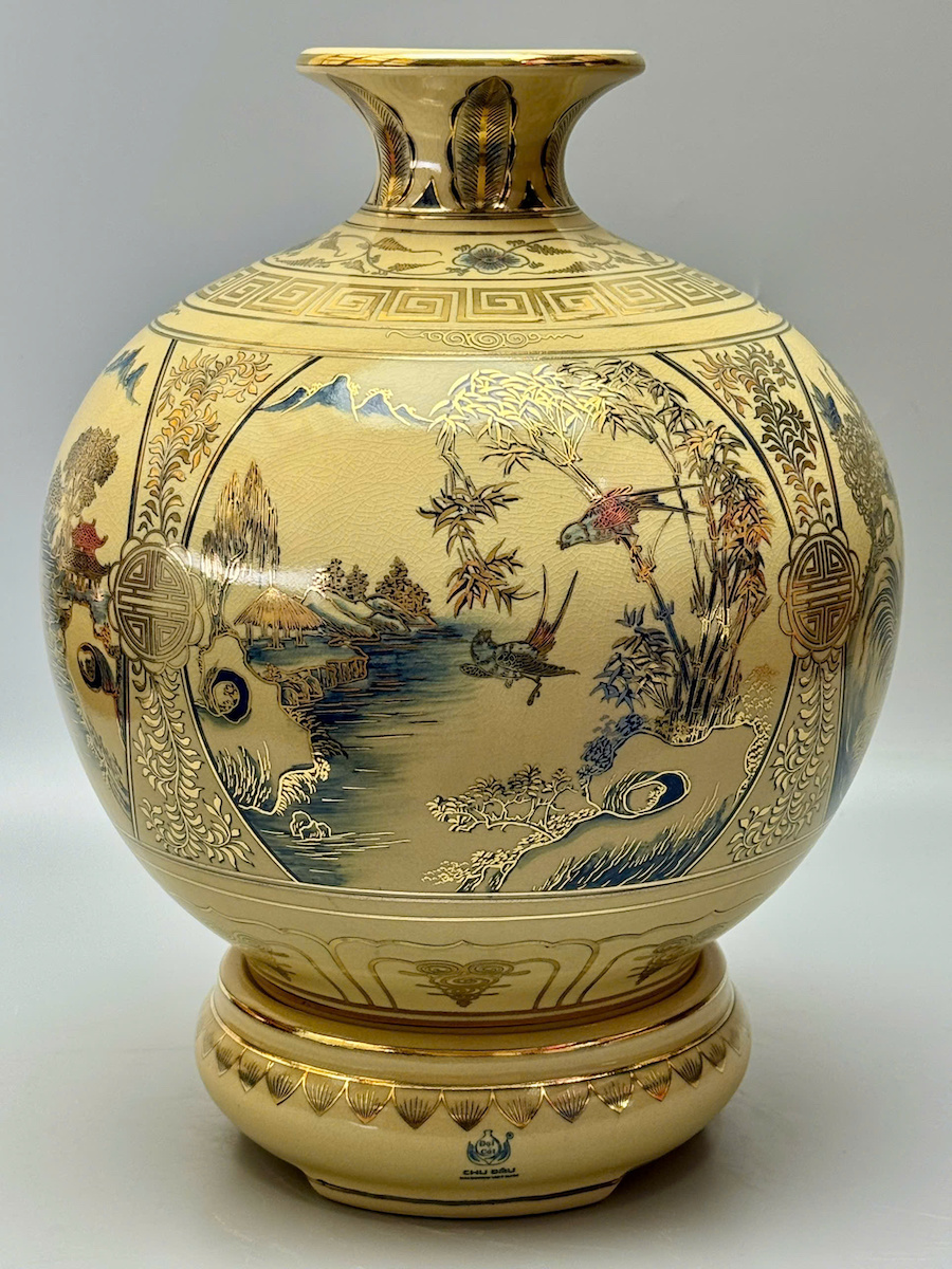 Bình Hút Lộc Tứ Cảnh Sơn Thuỷ Xanh Coban Cao 42cm Gốm Men Rạn Vẽ Vàng
