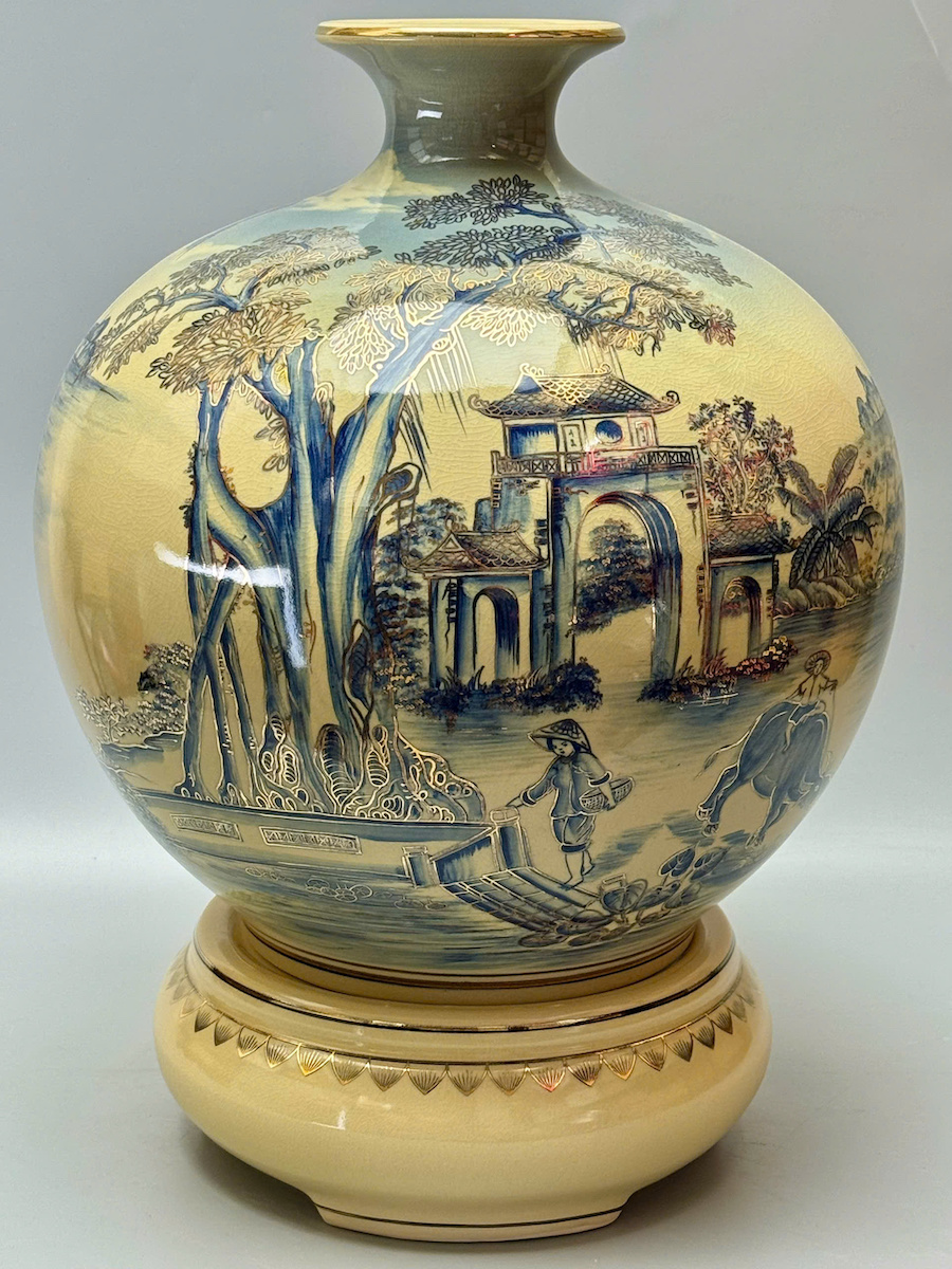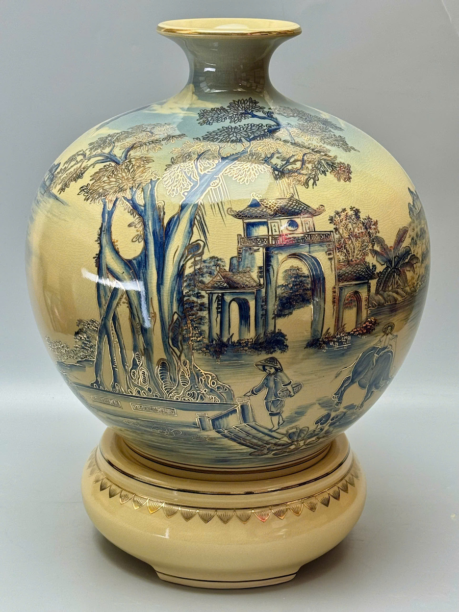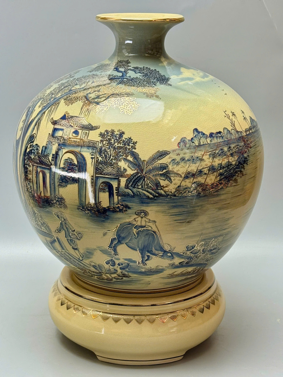 Bình Hút Tài Lộc Sơn Thuỷ Hữu Tình Xanh Coban Vẽ 3D H50 Gốm Chu Đậu Vẽ Vàng