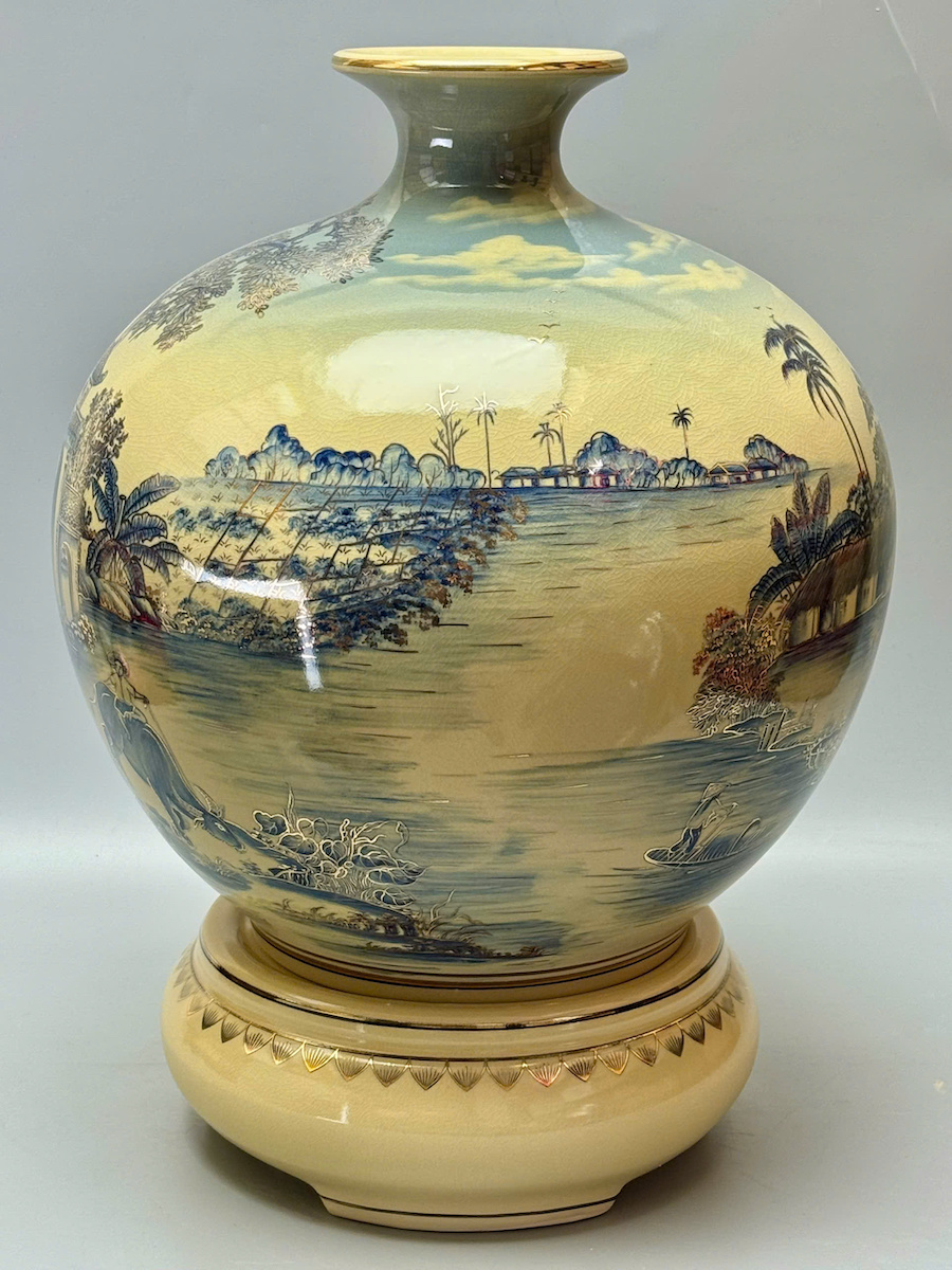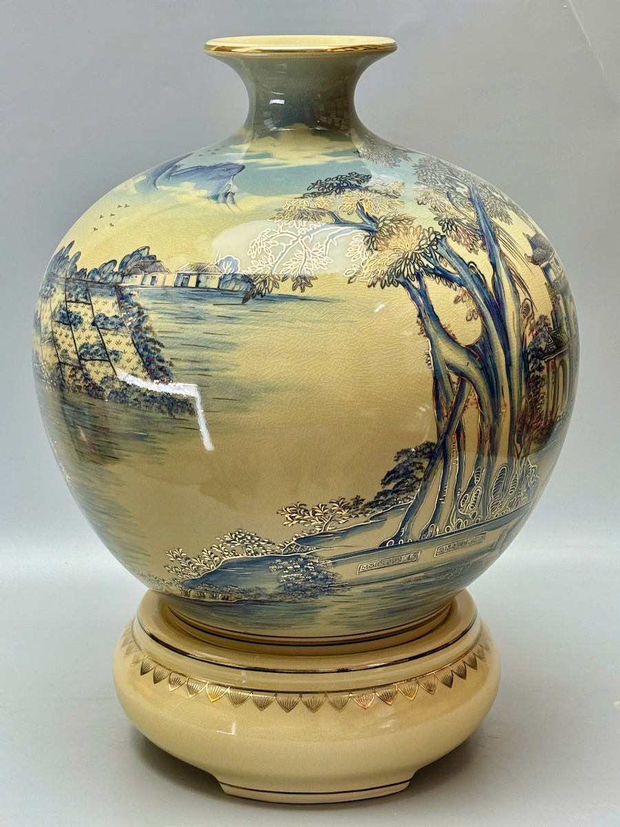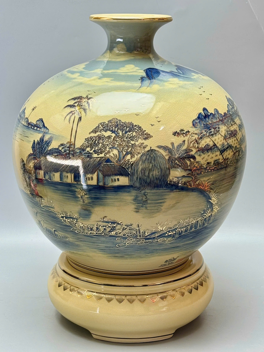 Bình Hút Tài Lộc Sơn Thuỷ Hữu Tình Xanh Coban Vẽ 3D H50 Gốm Chu Đậu Vẽ Vàng