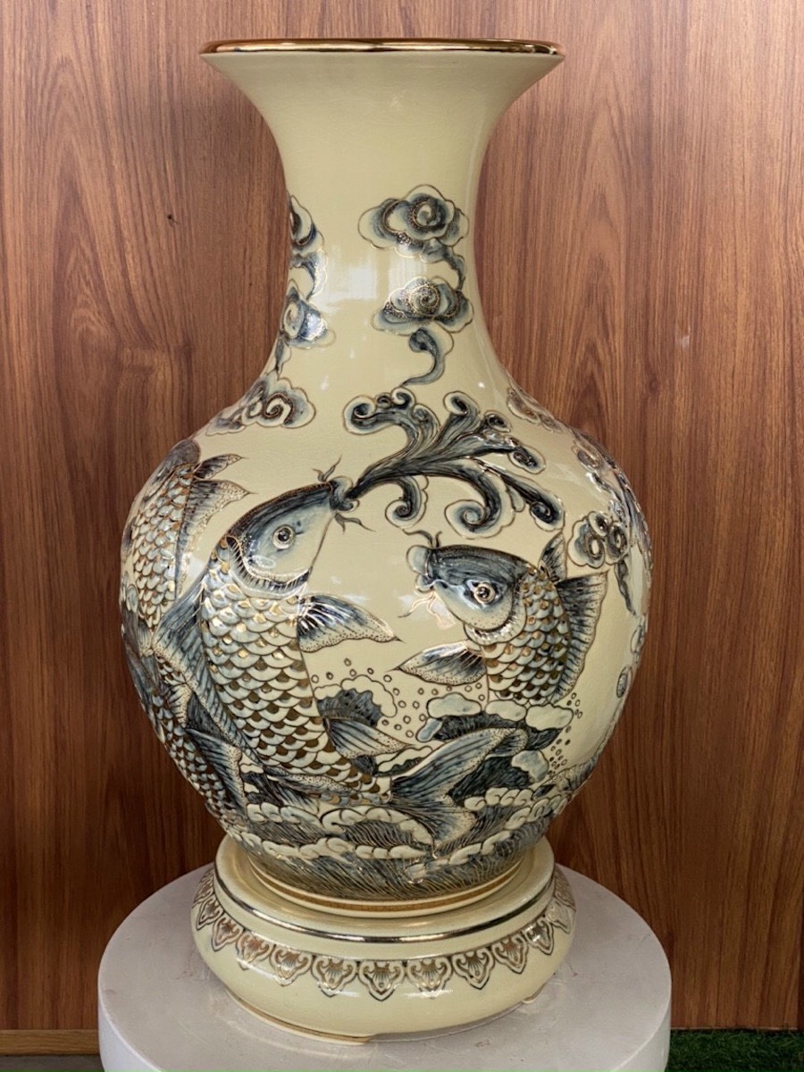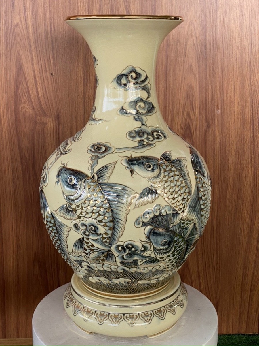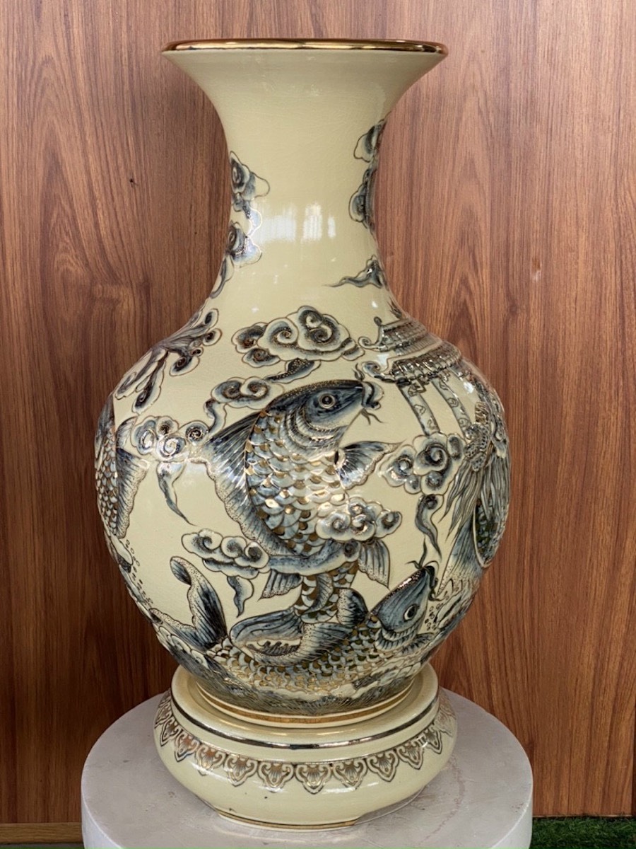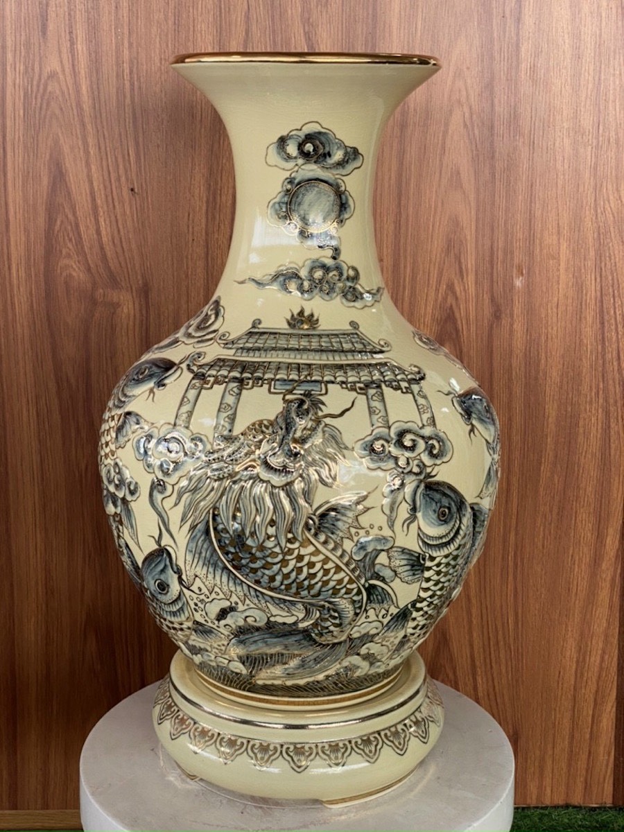 Bình Phú Quý Cá Chép Vượt Vũ Môn Hóa Rồng H50 Gốm Chu Đậu Vẽ Vàng