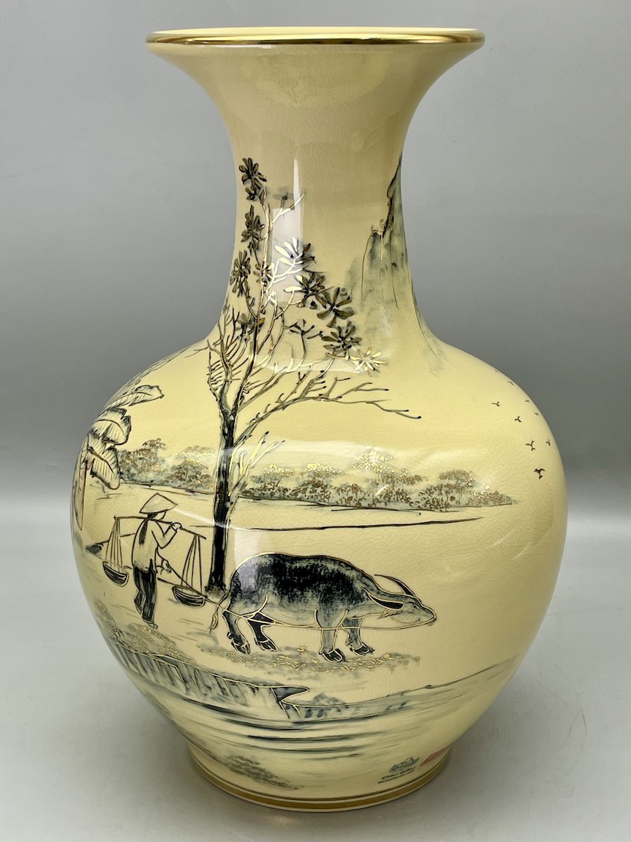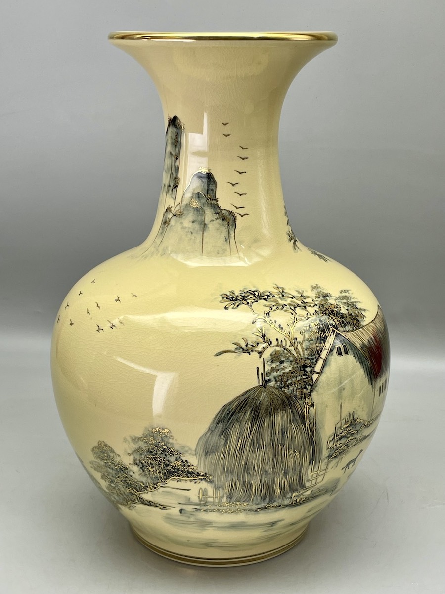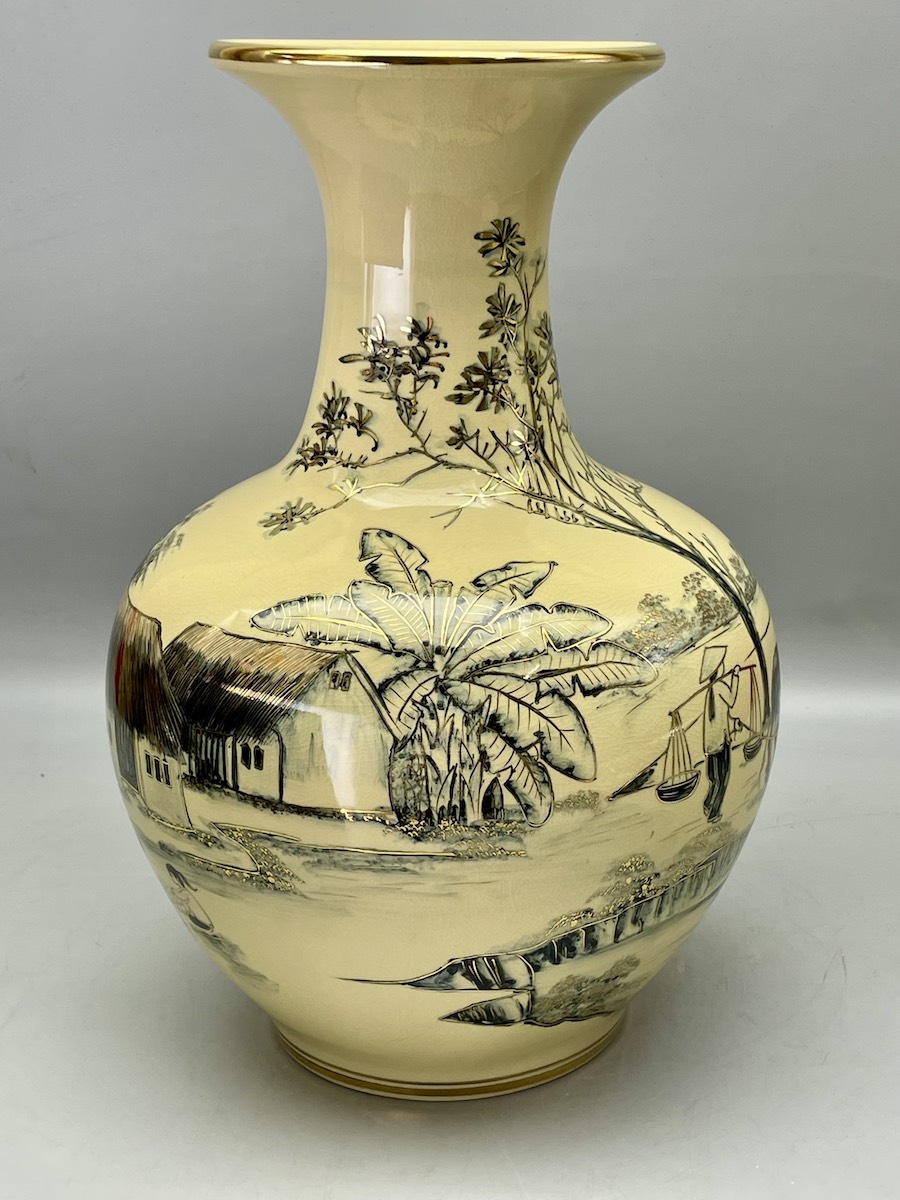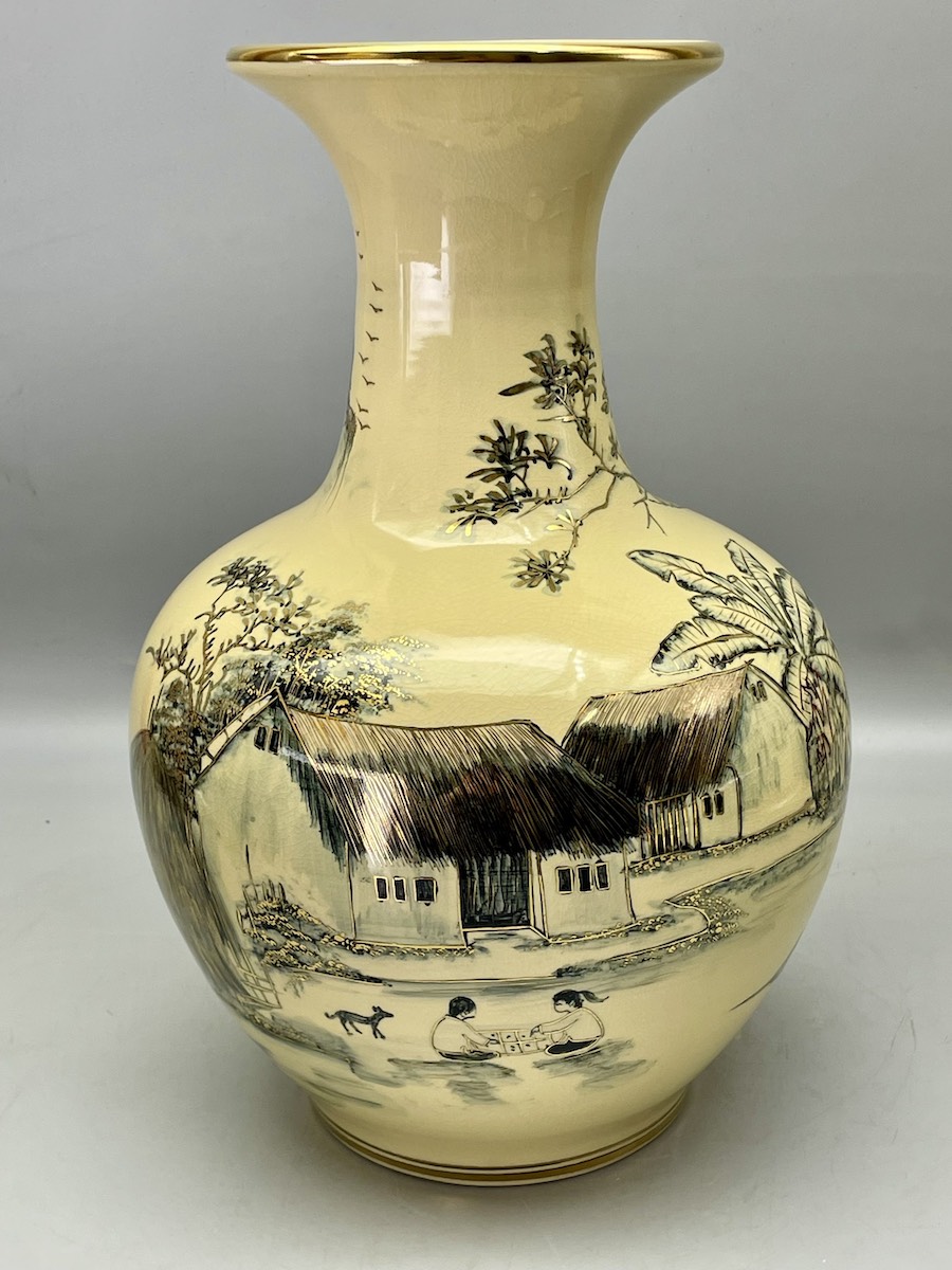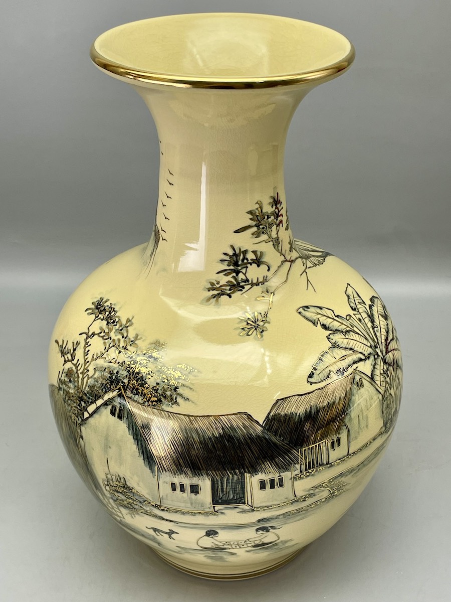 Bình Phú Quý Cảnh Đồng Quê H45 Gốm Chu Đậu Vẽ Vàng
