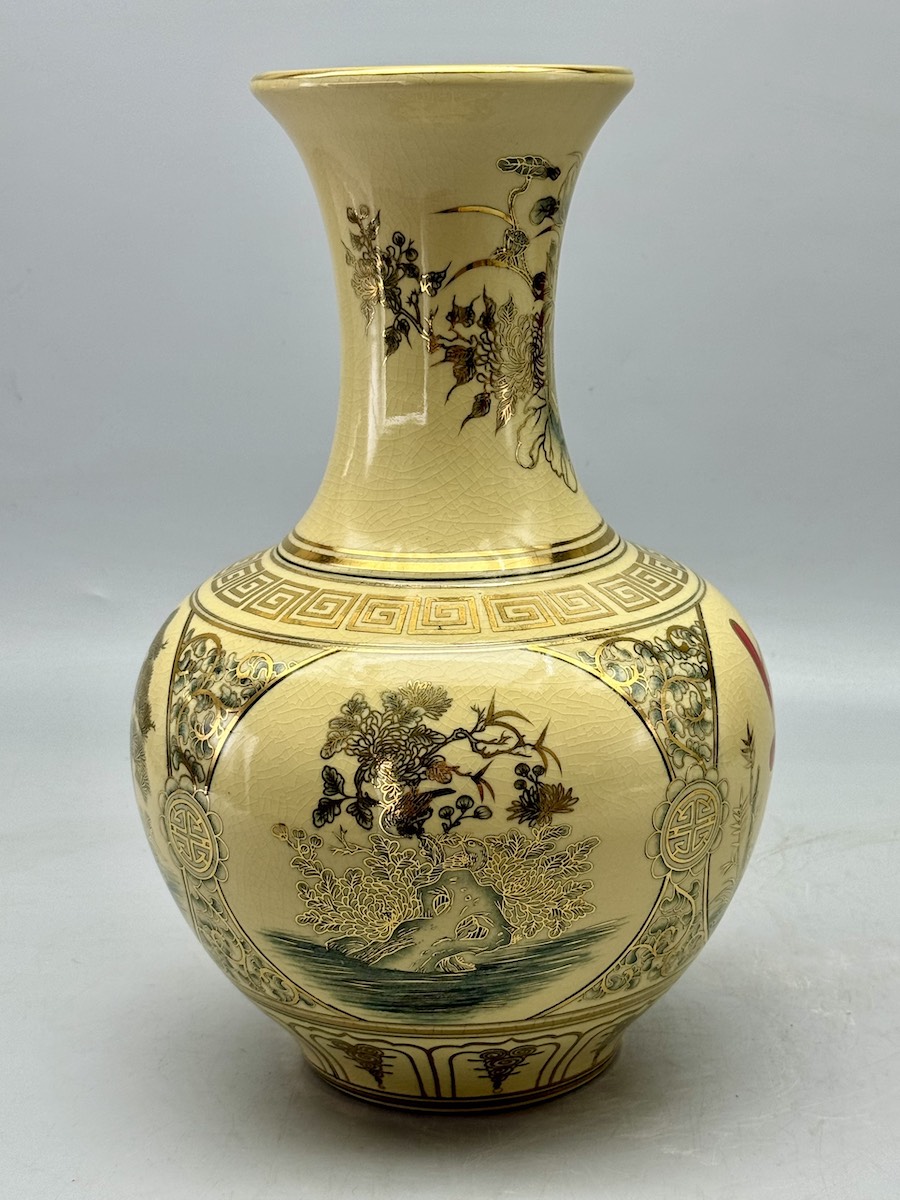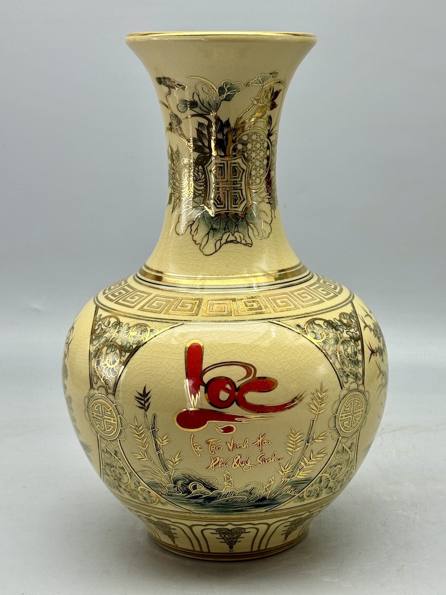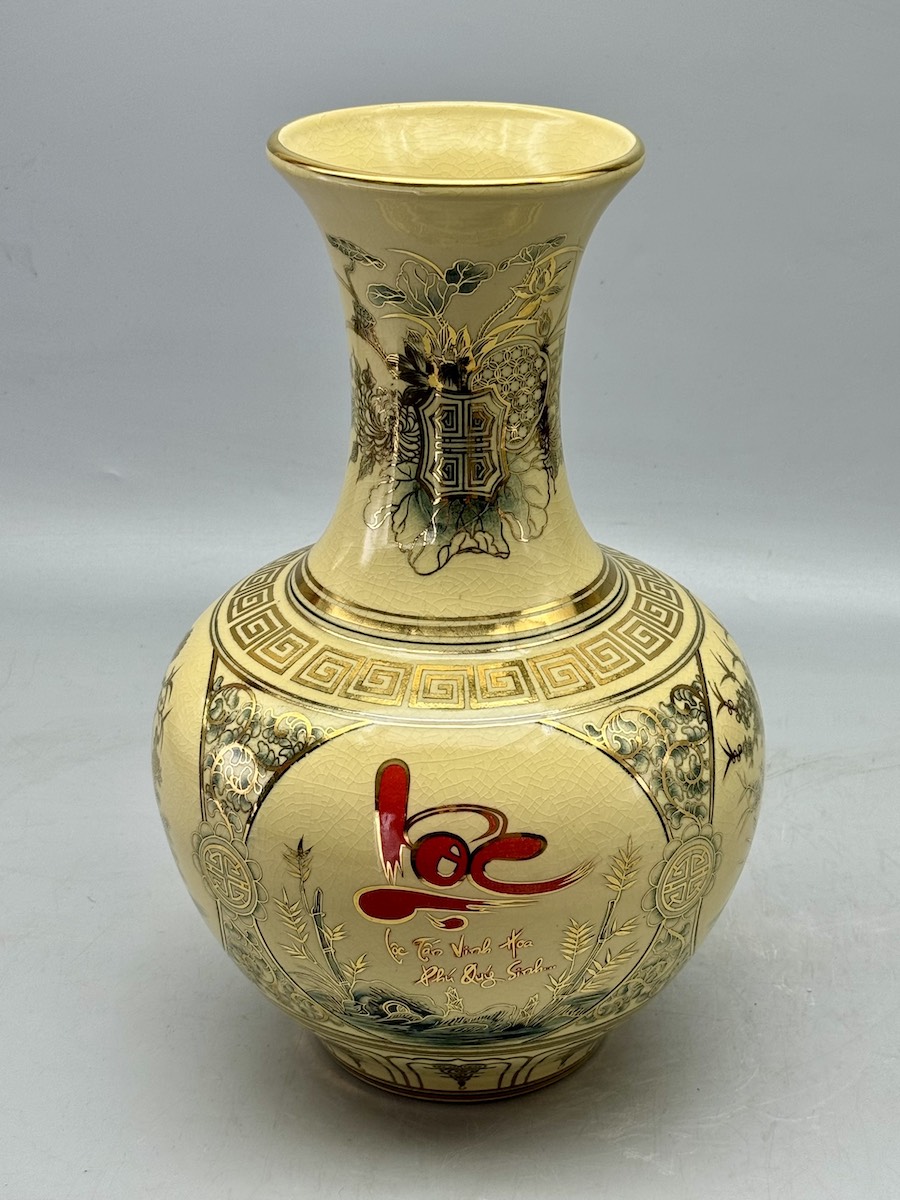 Bình Phú Quý Tứ Cảnh Chữ Lộc H35 Gốm Chu Đậu Vẽ Vàng Kim