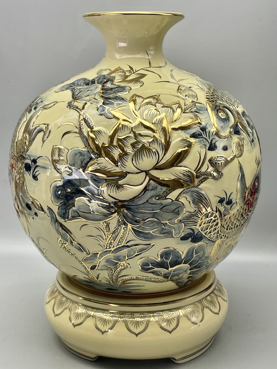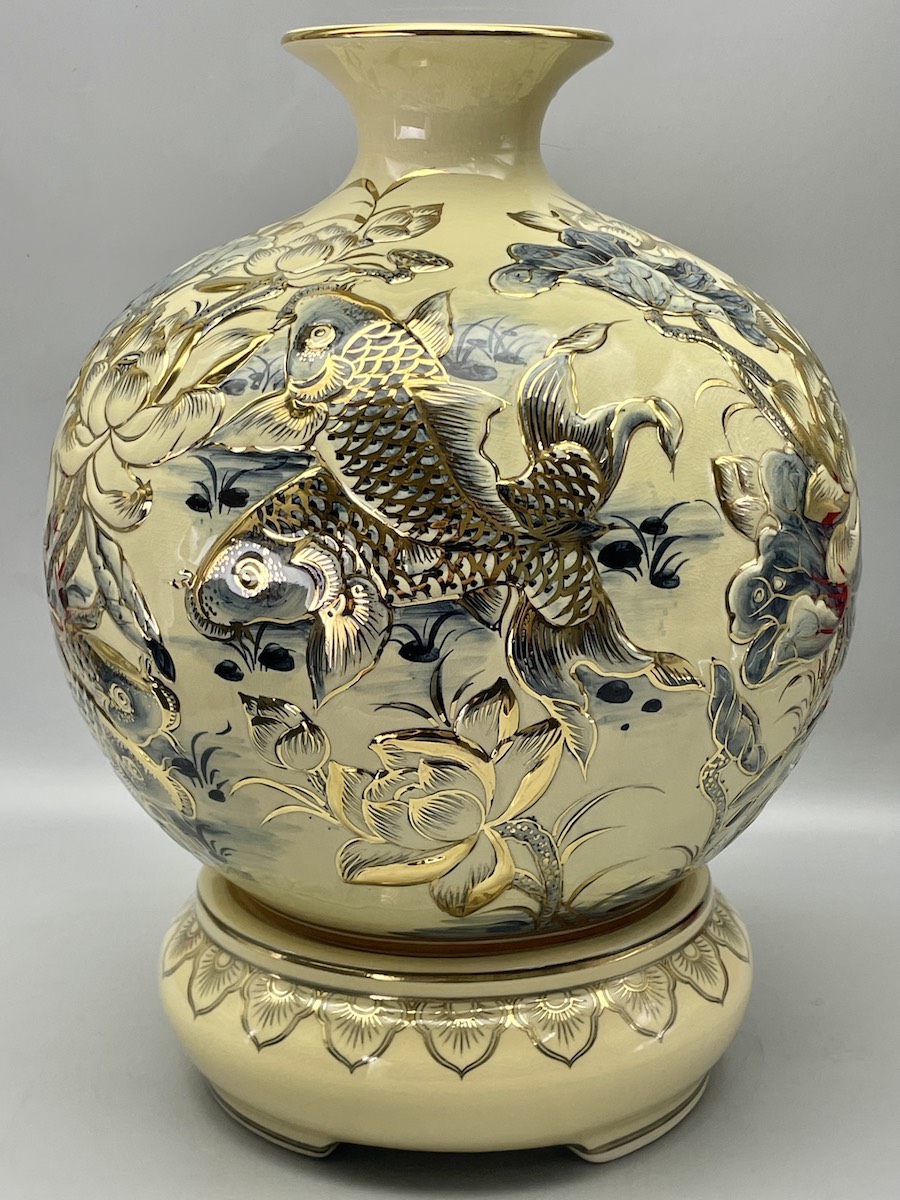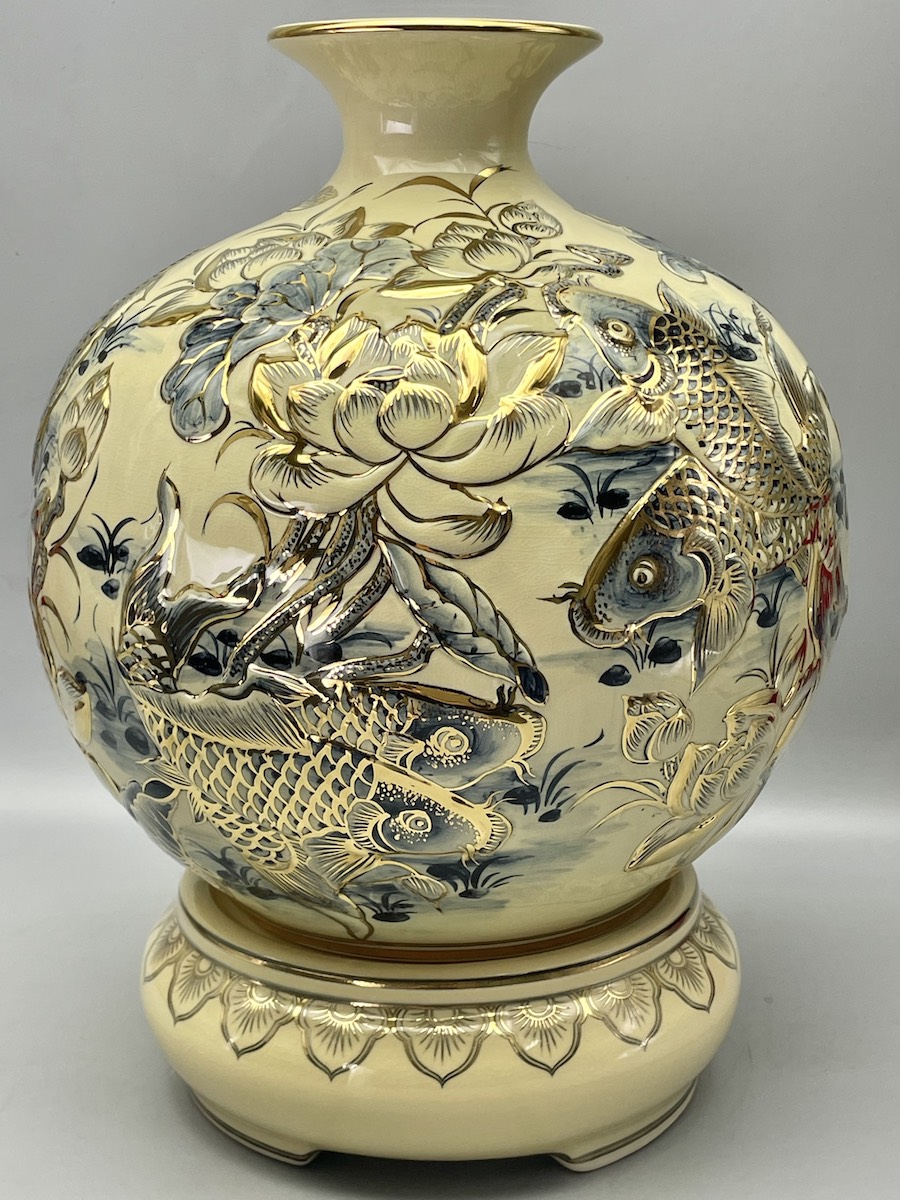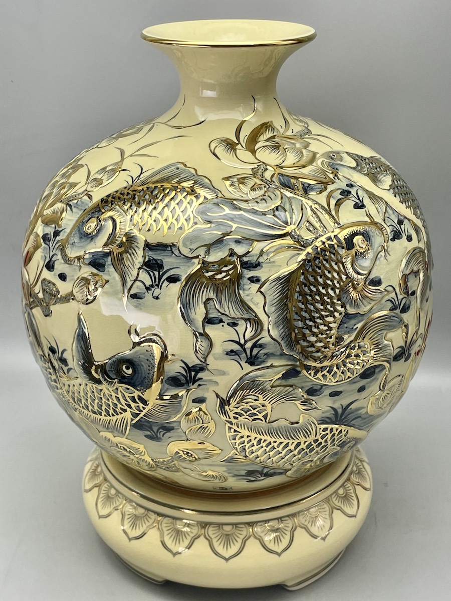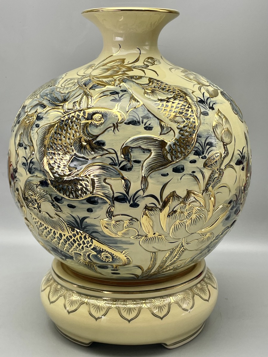 Bình Tài Lộc Cửu Ngư Hoa Sen Đắp Nổi Gốm Chu Đậu Vẽ Vàng