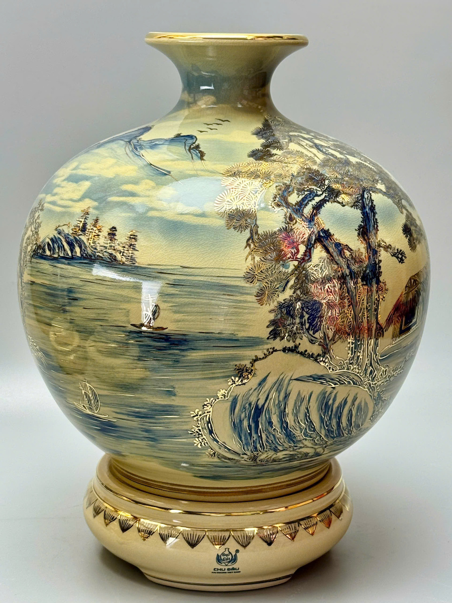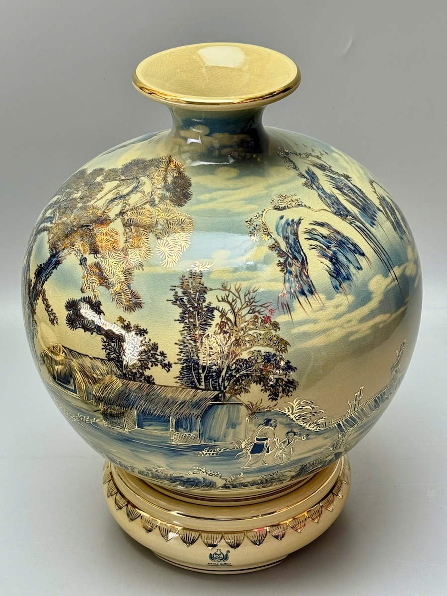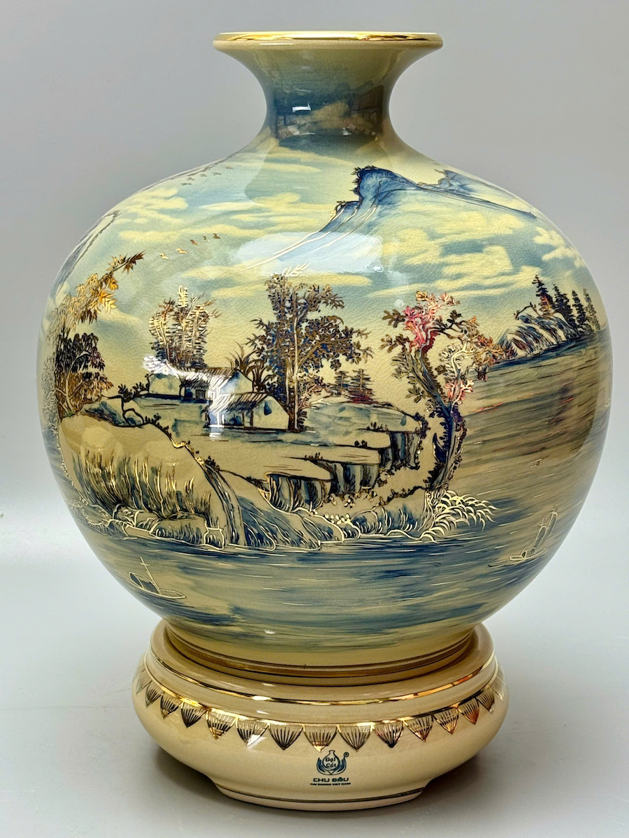 Bình Tài Lộc Sơn Thuỷ Hữu Tình 3D Màu Xanh Coban Cao 42cm Gốm Vẽ Vàng