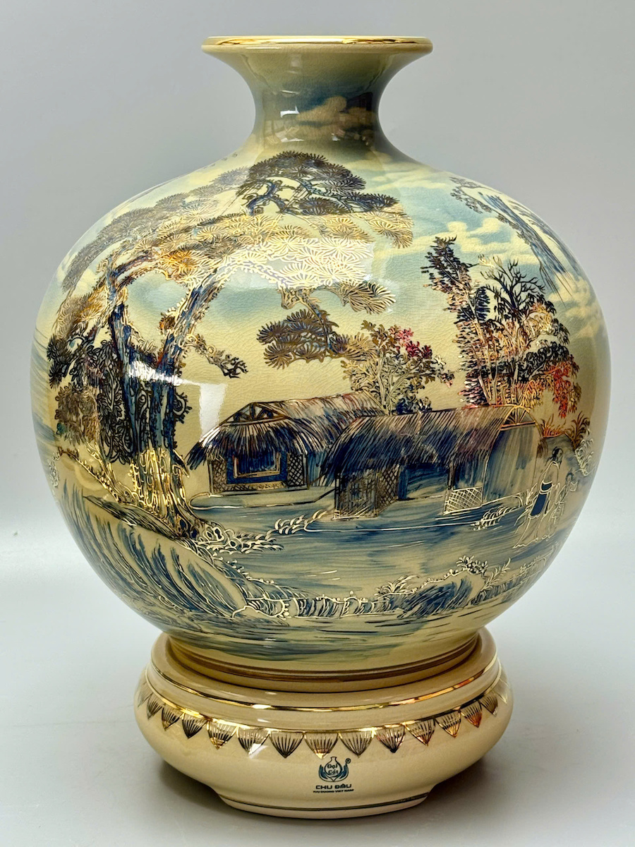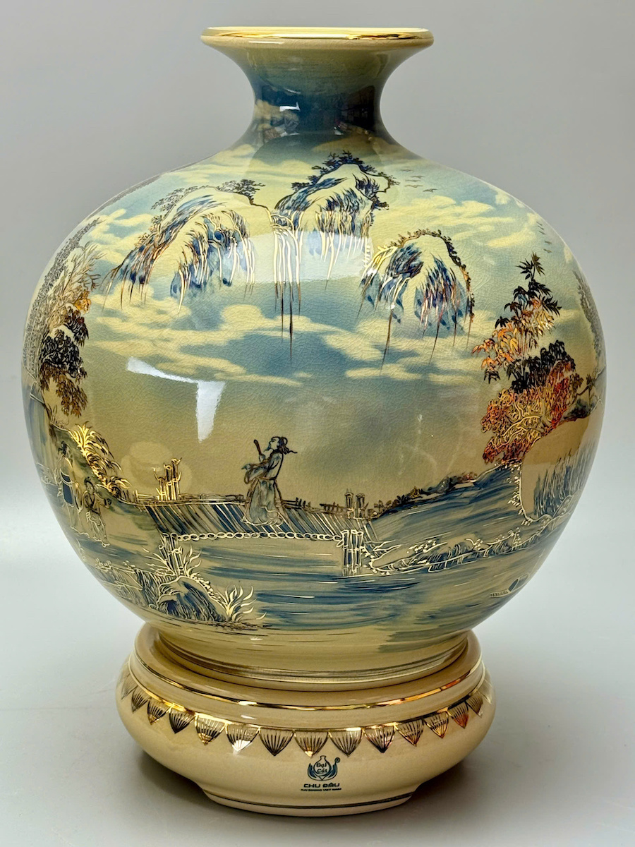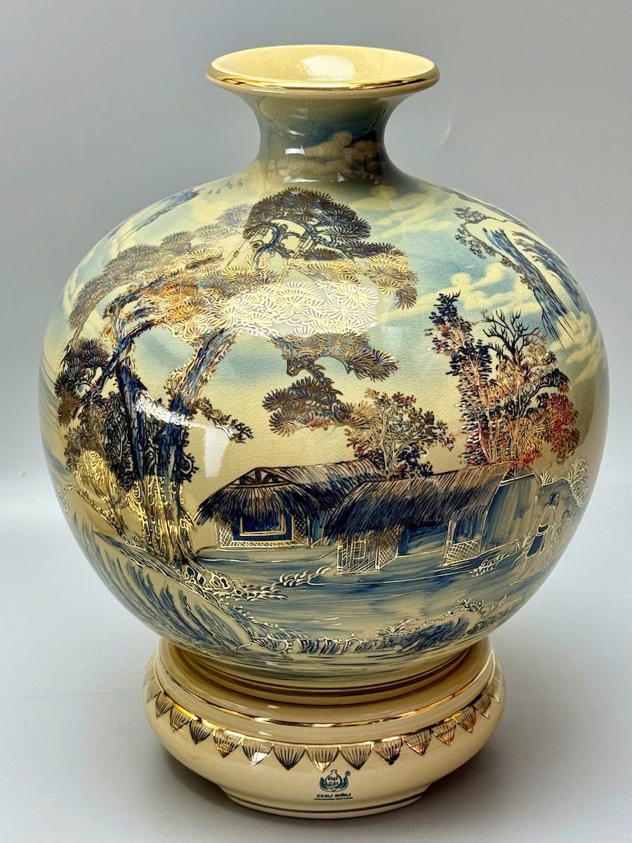 Bình Tài Lộc Sơn Thuỷ Hữu Tình 3D Màu Xanh Coban Cao 42cm Gốm Vẽ Vàng