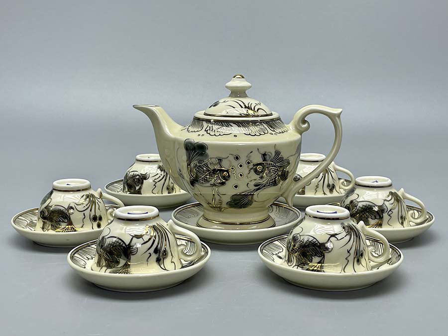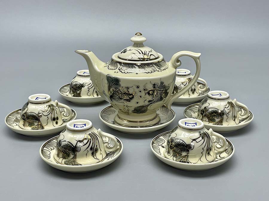 - Bộ trà gốm Chu Đậu cá Chép vẽ vàng 24K kiểu dáng cổ điển kết hợp phong cách hiện đại được các nghệ nhân làng nghề Chu Đậu vẽ thủ công hoàn toàn với chất liệu men truyền thống đặc trưng gốm Chu Đậu thể hiện sự trang trọng, tinh tế ẩn chứa nét văn hoá được mệnh danh là “gốm đạo" của người Việt.