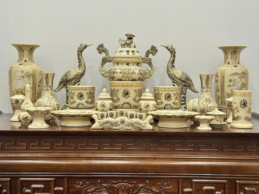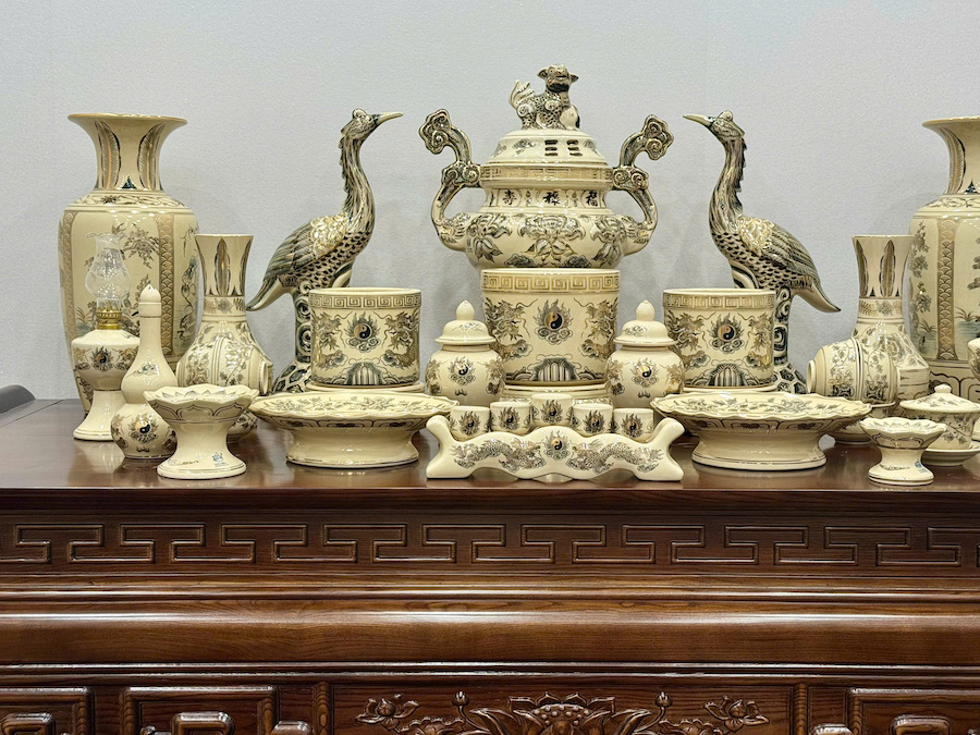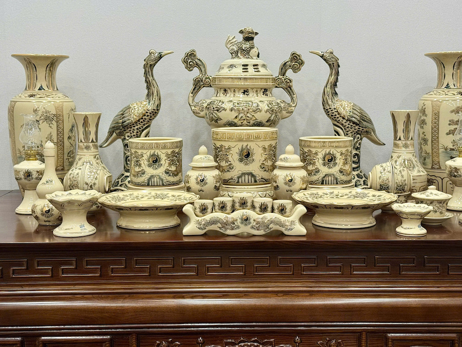 Bộ Đồ Hoạ Tiết Rồng Kèm Đỉnh Hạc Cho Ban Thờ 1,97m Gốm Vẽ Vàng