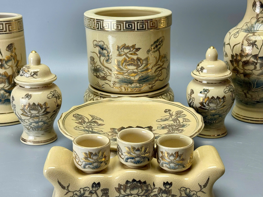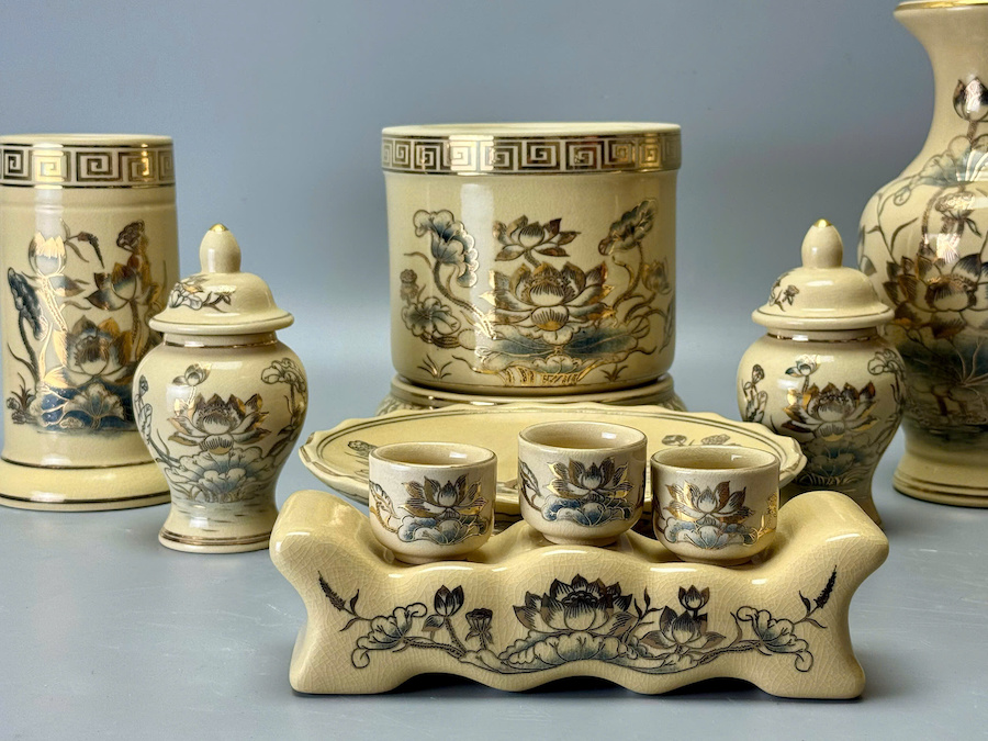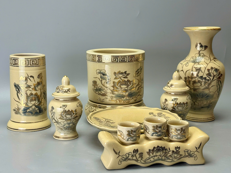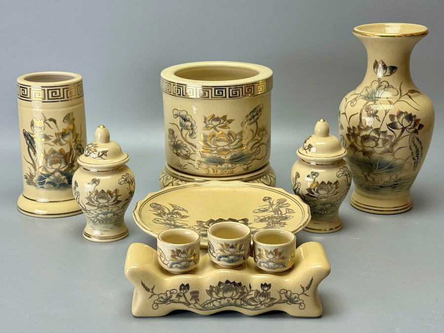 Bộ Đồ Thờ Ban Thờ 69cm Hoạ Tiết Sen Gốm Chu Đậu Vẽ Vàng