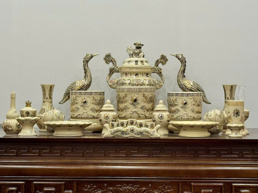 Bộ Đồ Thờ Bát Hương Đắp Nổi + Đỉnh Hạc Gốm Chu Đậu Vẽ Vàng