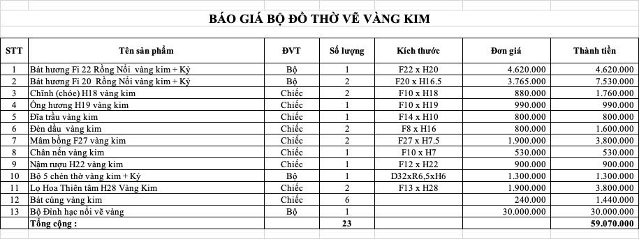 BẢNG KÊ CHI TIẾT CÁC MÓN ĐỒ THỜ: