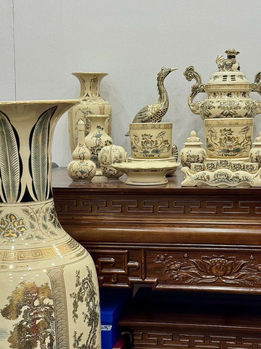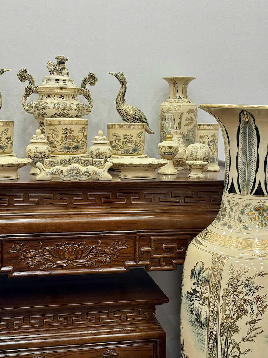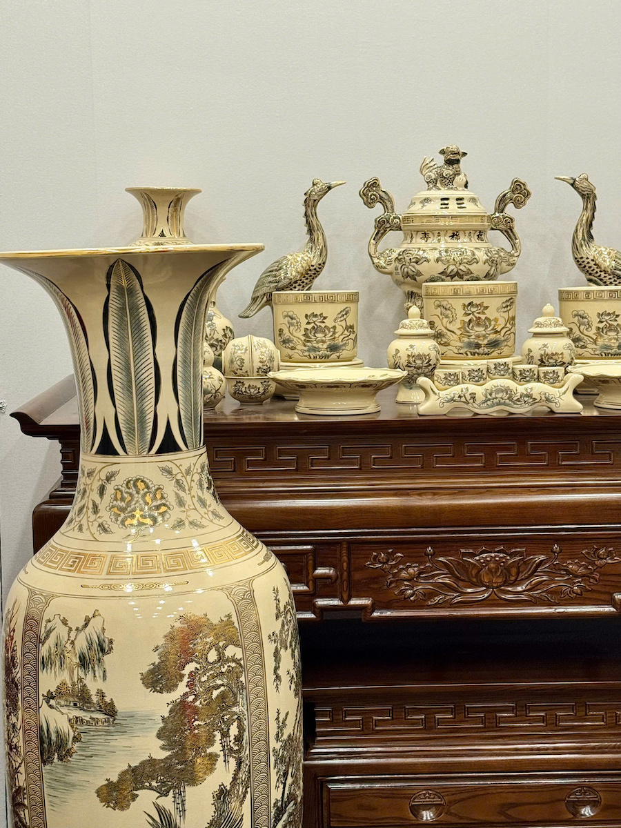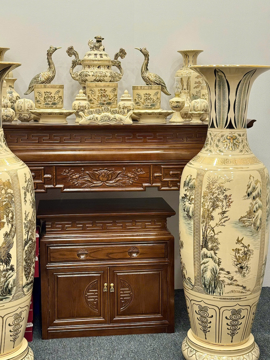 - Bộ đồ thờ gốm Chu Đậu vẽ vàng là sự kết tinh giữa nghệ thuật gốm cổ truyền Việt Nam và tay nghề thủ công tinh xảo của các nghệ nhân Chu Đậu Hải Dương. Mỗi chi tiết được vẽ tay tỉ mỉ bằng vàng 24K, mang đến vẻ đẹp sang trọng – linh thiêng – bền vững theo thời gian.
