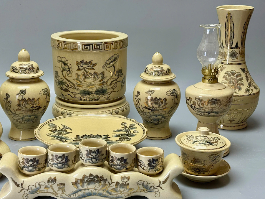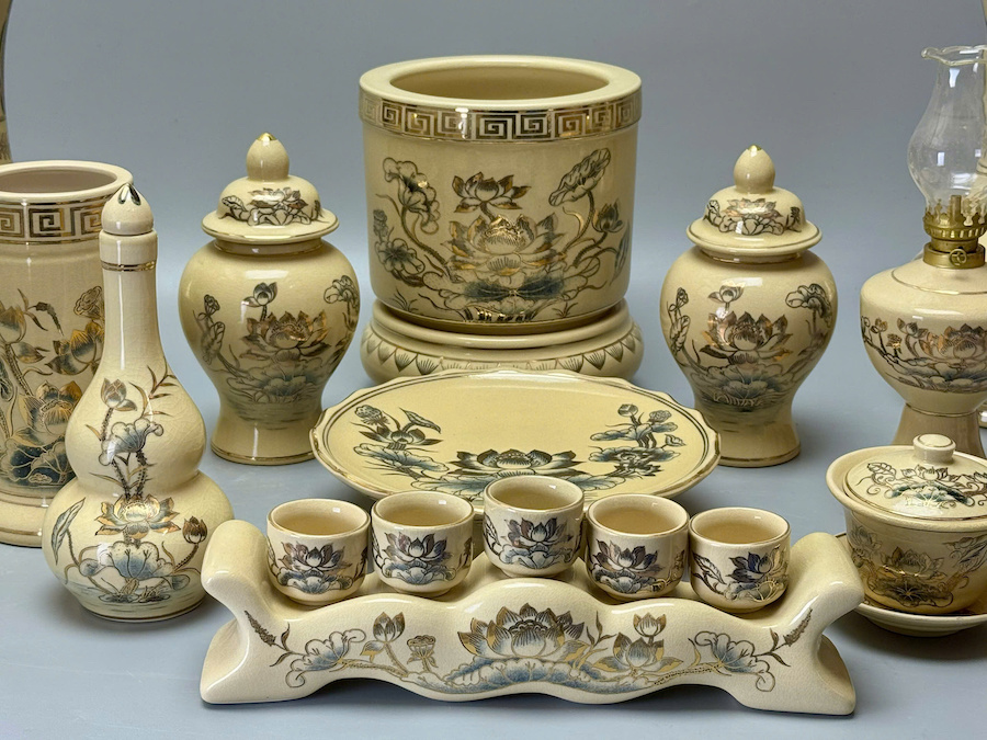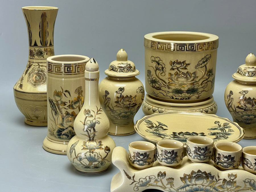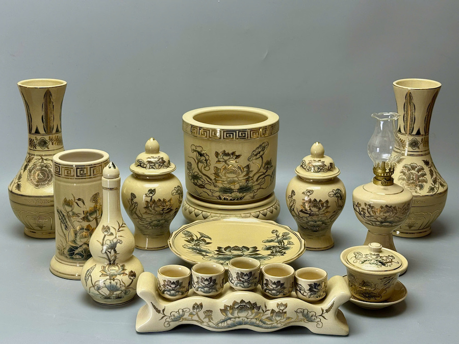 Bộ Đồ Thờ Cho Ban 1,27m-1,53m Hoạ Tiết Hoa Sen Gốm Chu Đậu Vẽ Vàng