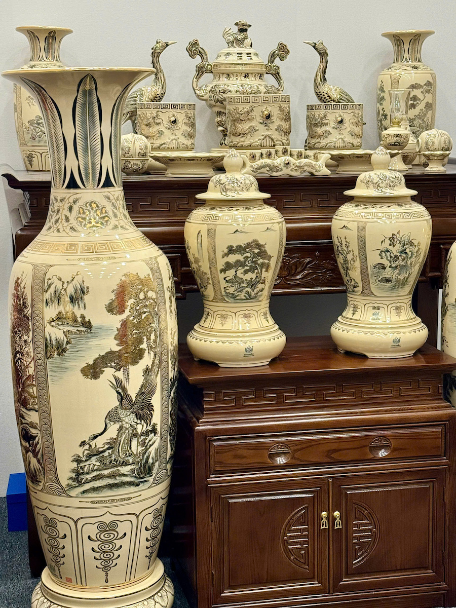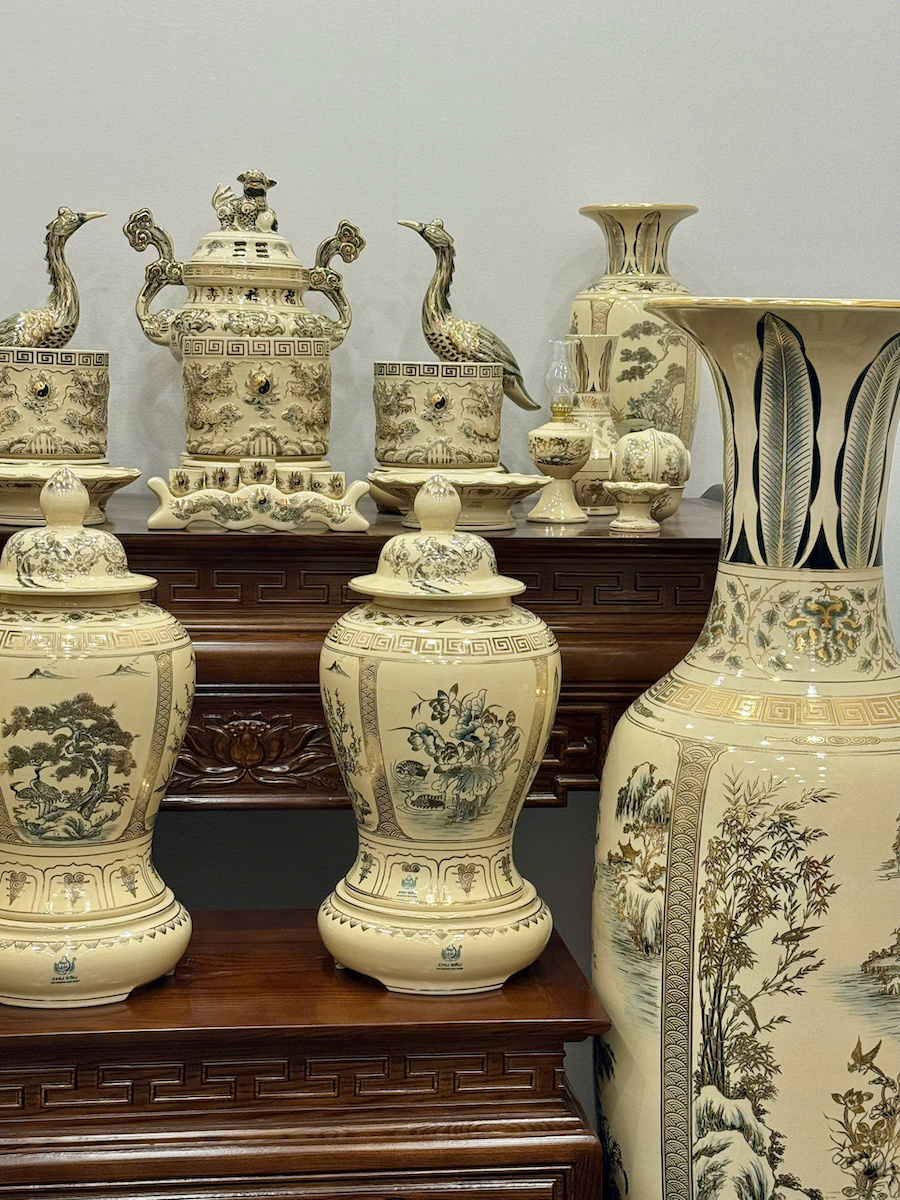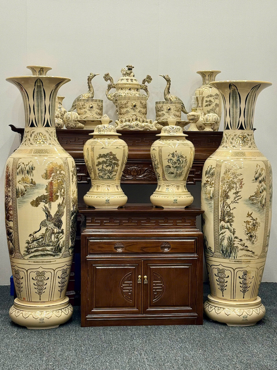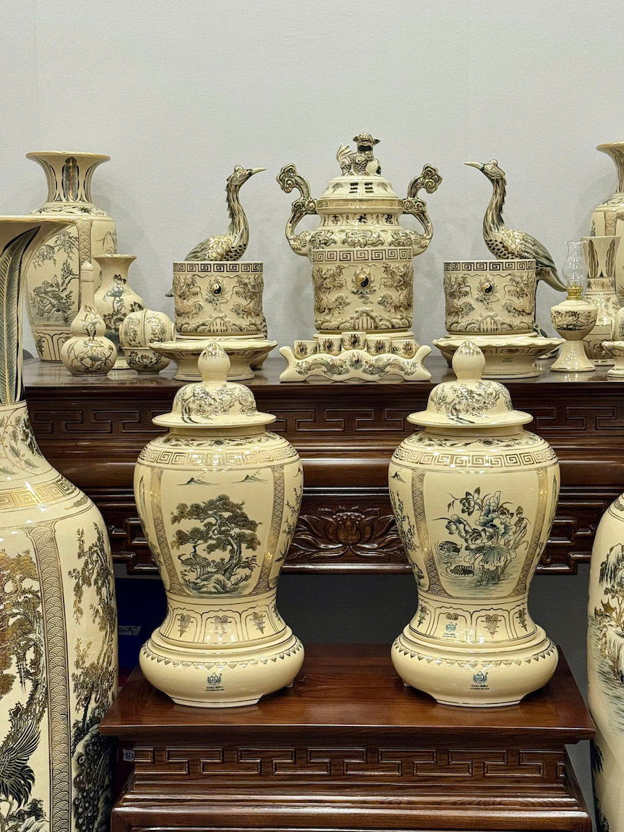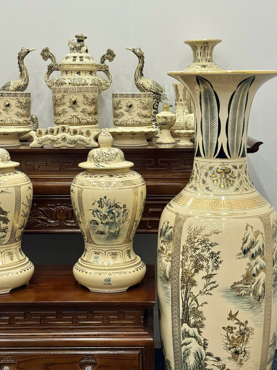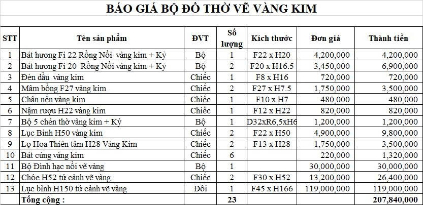 Bộ Đồ Thờ Cho Ban 1,75m đến 1,97m Đầy Đủ Choé + Đỉnh + Lục Bình 1,66m Gốm Chu Đậu Vẽ Vàng