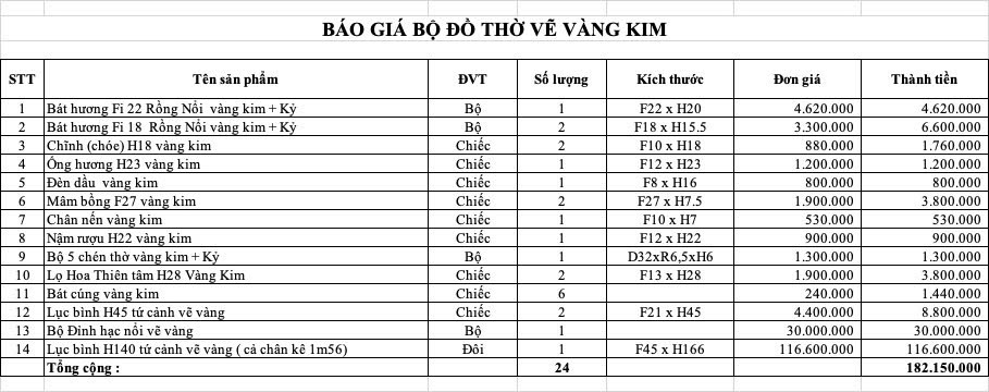 Bộ sản phẩm gồm đầy đủ các vật phẩm thờ cúng cần thiết: