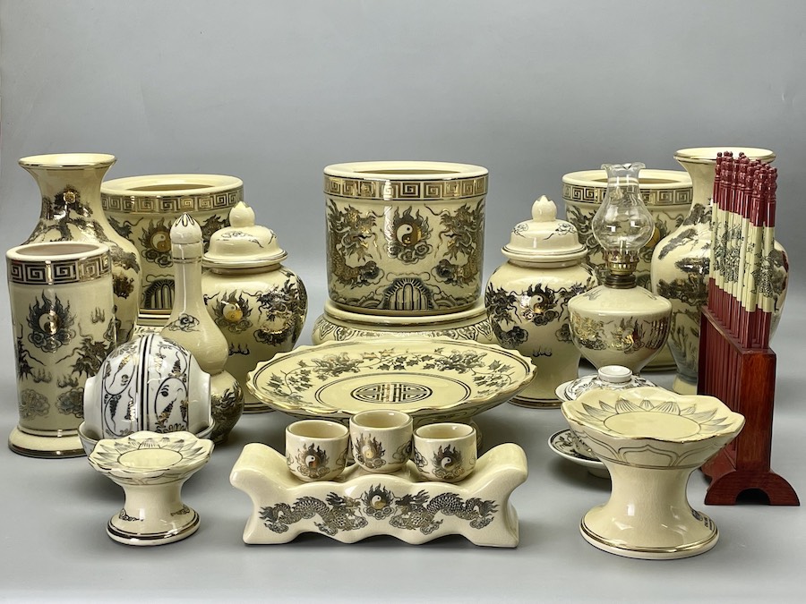 Bộ Đồ Thờ Gốm Chu Đậu Hoạ Tiết Rồng Trầu 1,57m x 61cm