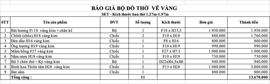 BẢNG KÊ CHI TIẾT CÁC MÓN ĐỒ THỜ