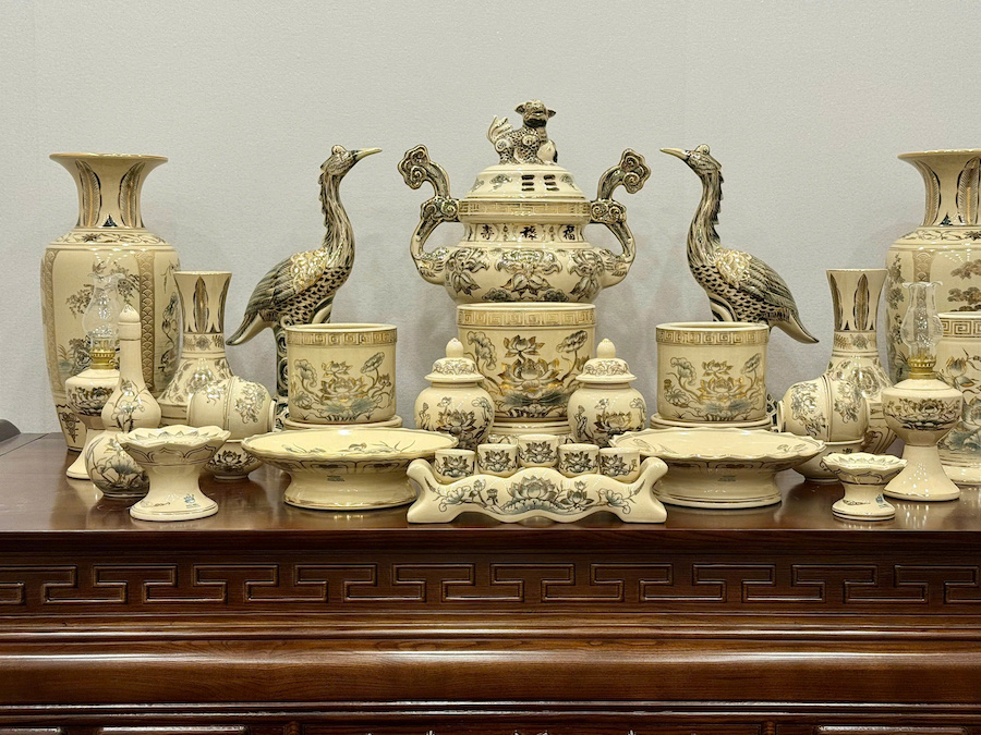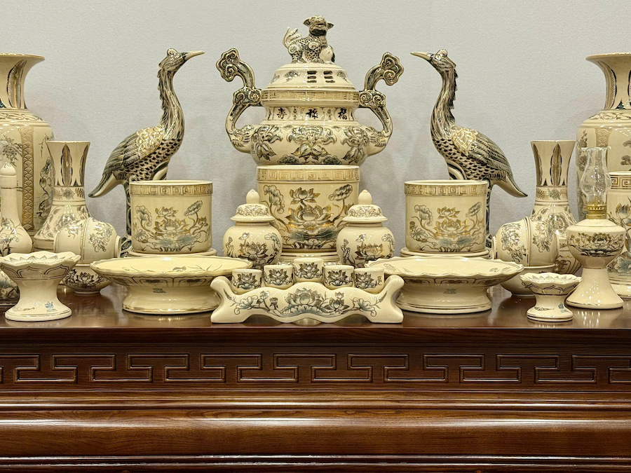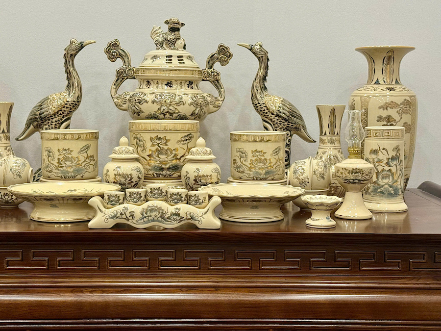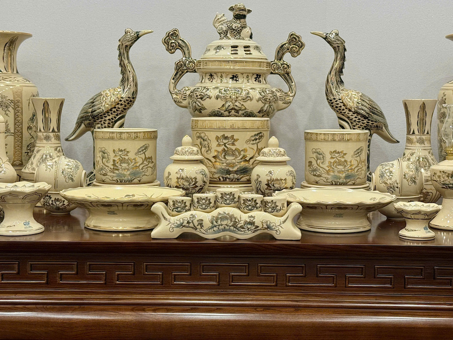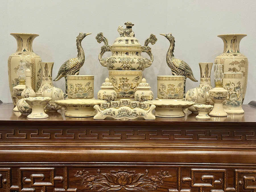 Bộ Đồ Thờ Hoa Sen + Đỉnh Hạc Ban Thờ 1,75m Gốm Vẽ Vàng