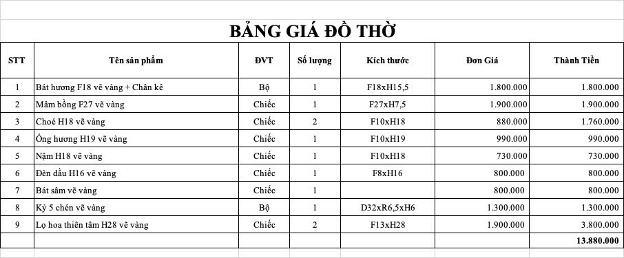 Bộ Đồ Thờ Hoạ Tiết Hoa Sen Cho Ban 1,57m Gốm Chu Đậu Vẽ Vàng