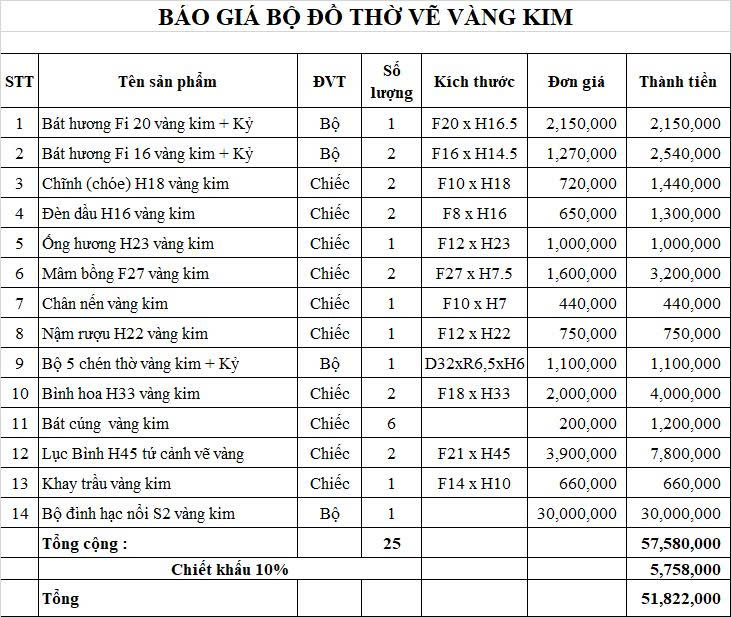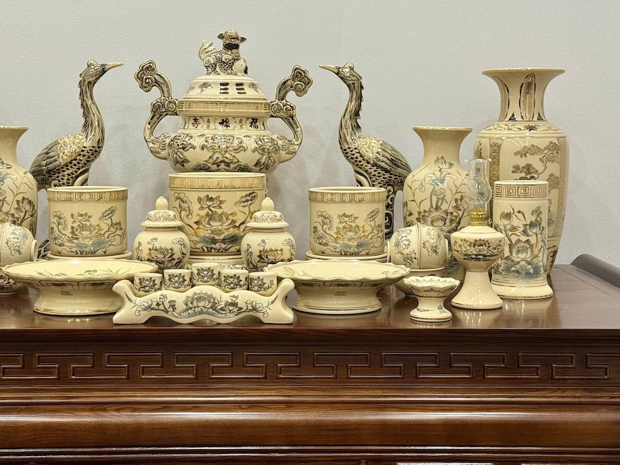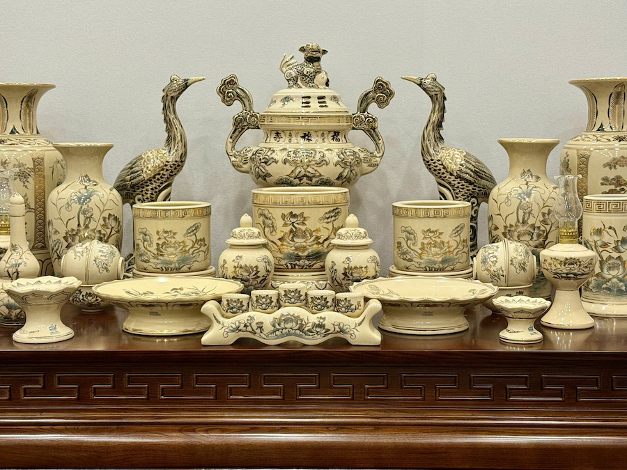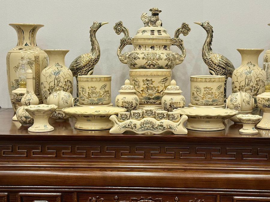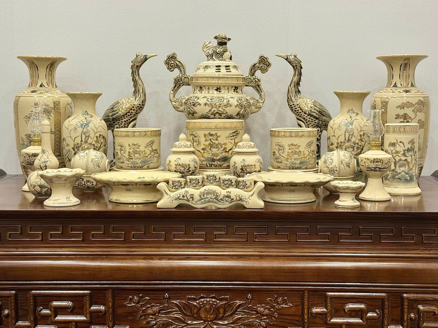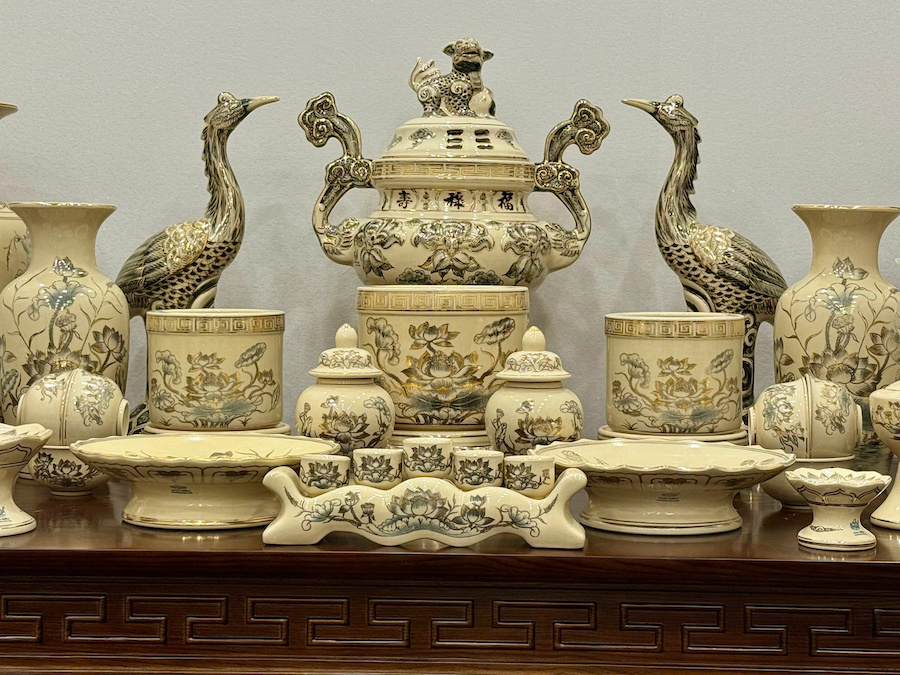 Bộ Đồ Thờ Hoạ Tiết Sen + Đỉnh Hạc Ban Thờ 1,75m Gốm Vẽ Vàng