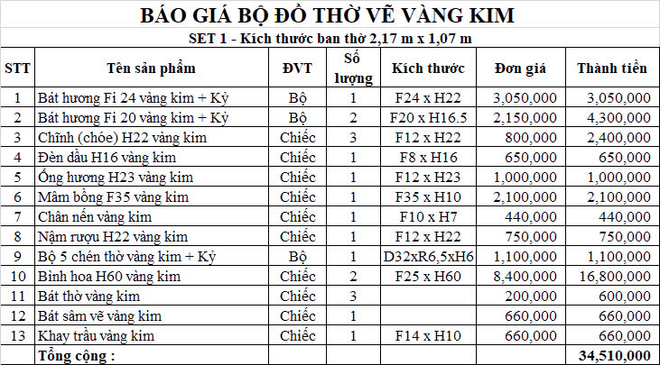 SET 1 - Bộ Đồ Cho Ban Thờ Kích Thước 2,17m x 1,07m Gốm Chu Đậu Vẽ Vàng