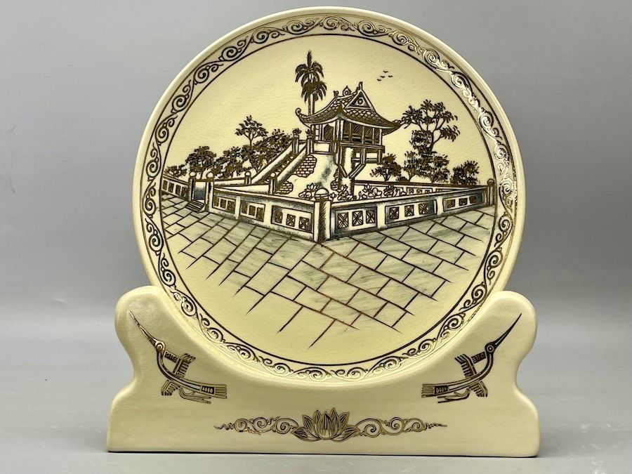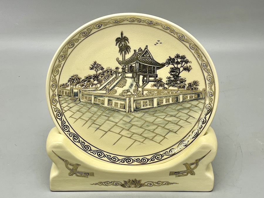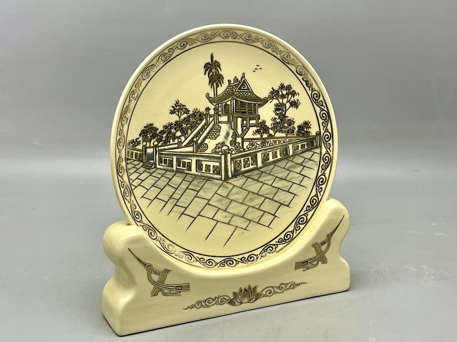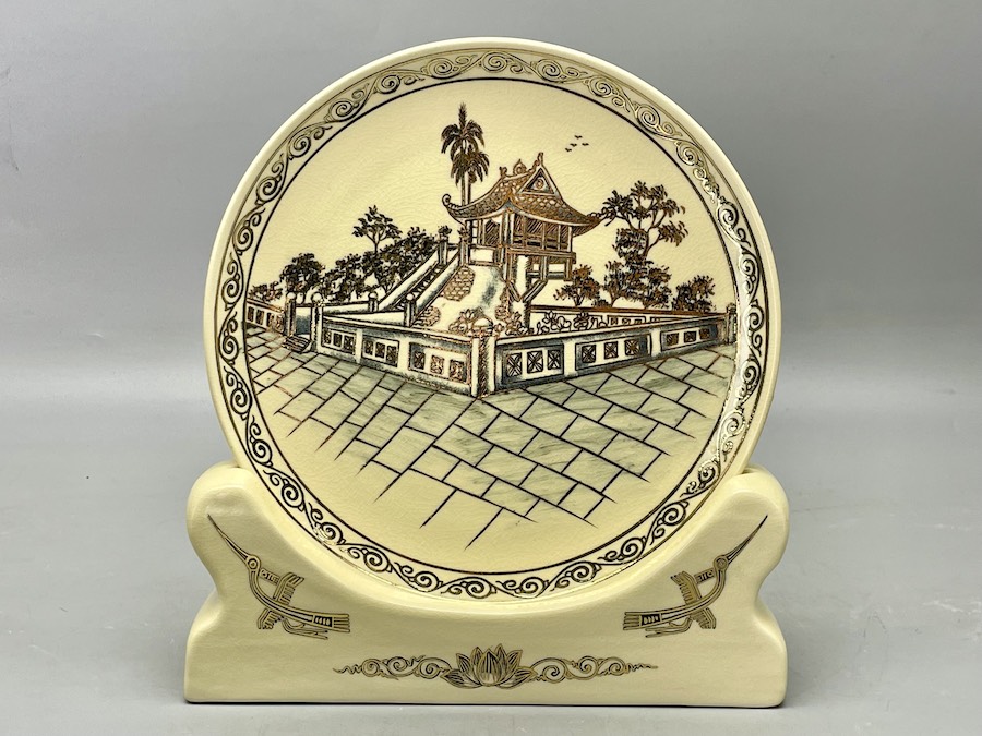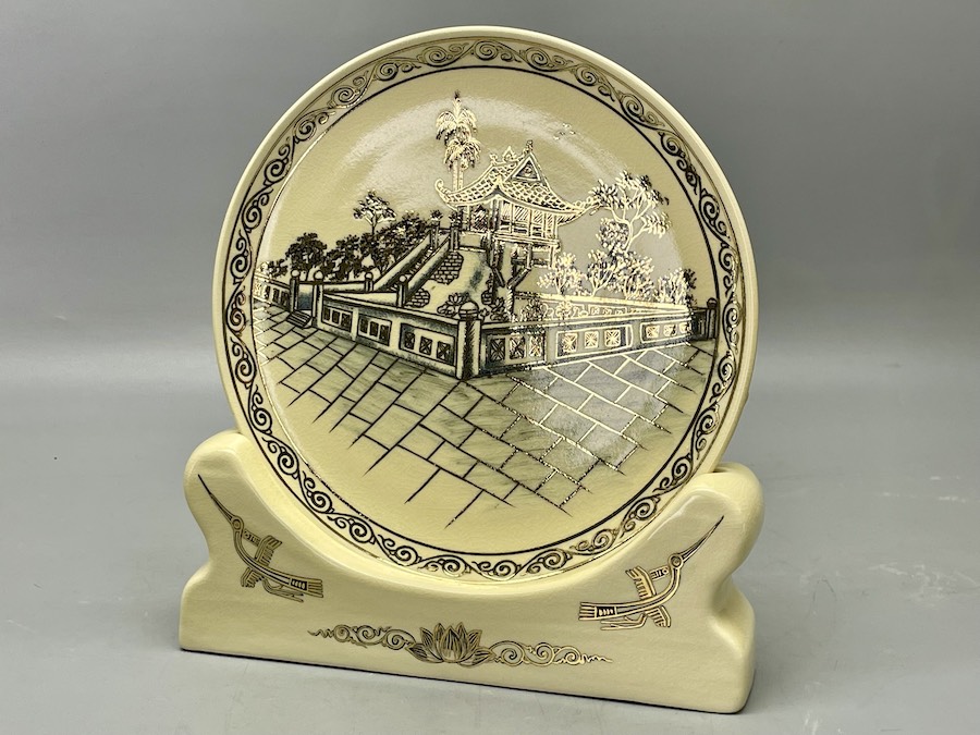 Đĩa Cảnh Chùa Một Cột Fi23 Gốm Chu Đậu Vẽ Vàng