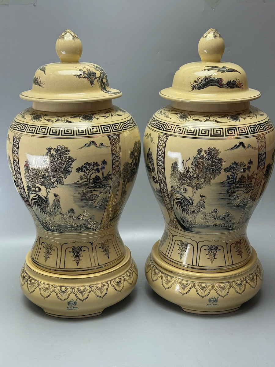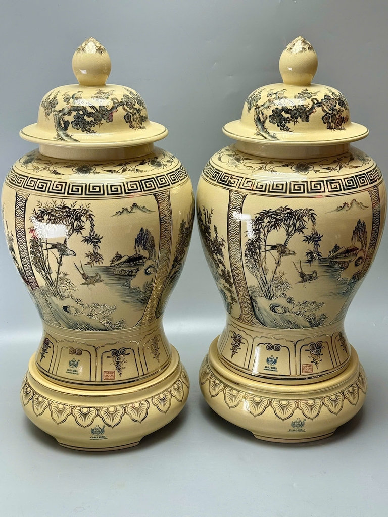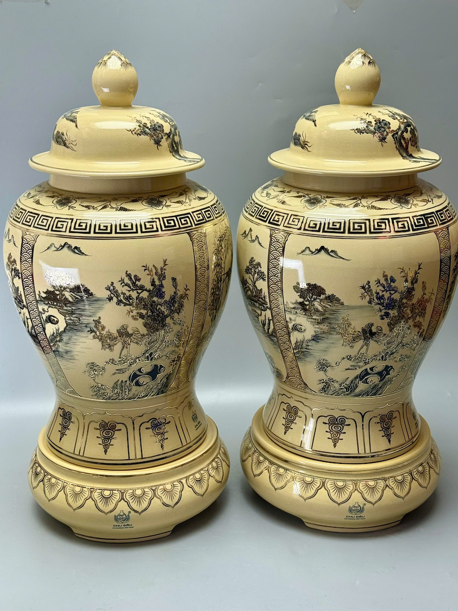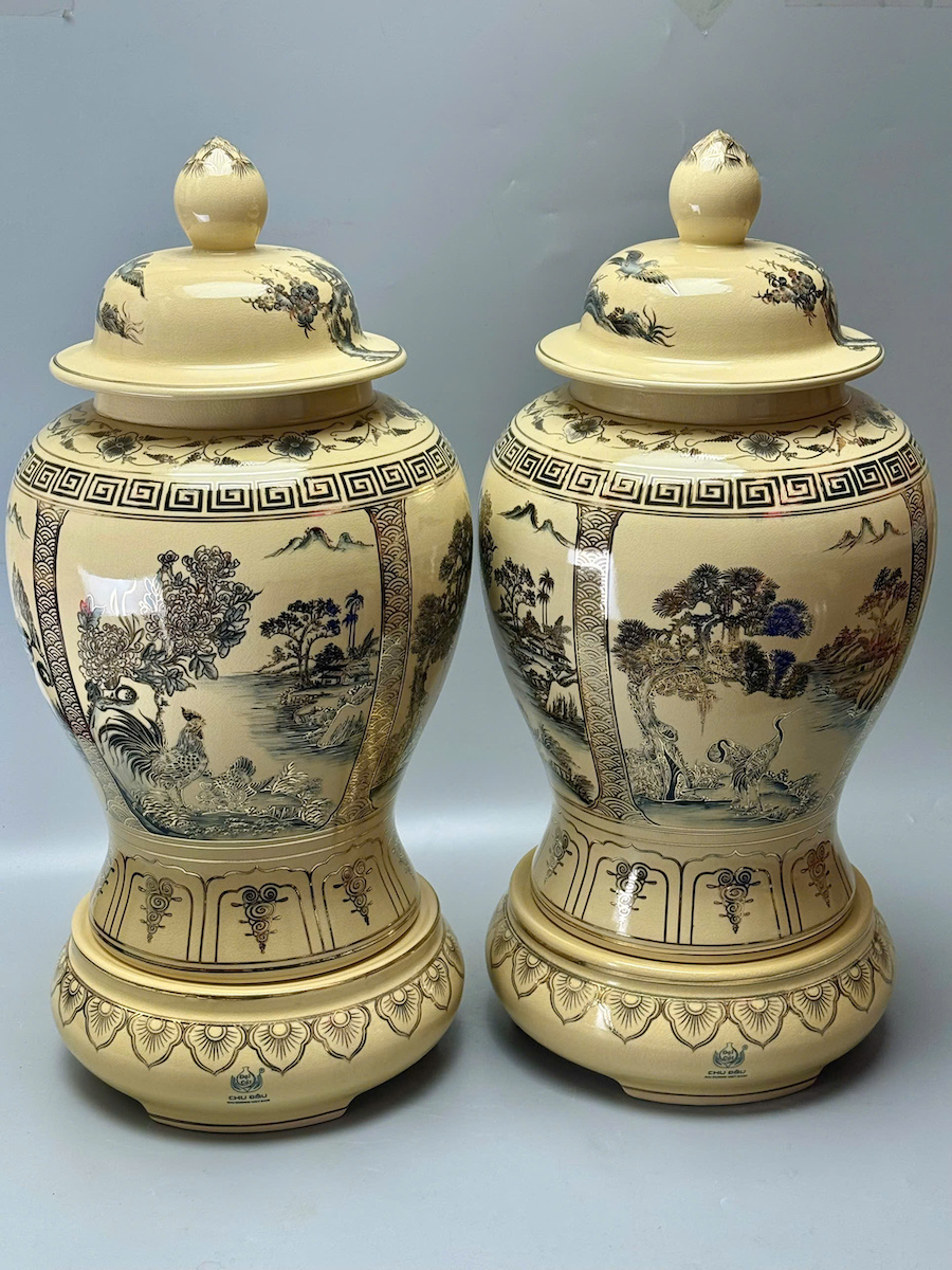 Đôi Choé Cao 72cm Hoạ Tiết Tứ Cảnh Sơn Thuỷ Gốm Chu Đậu Vẽ Vàng 24K