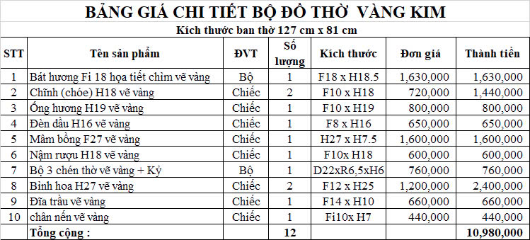 - Bảng kê chi tiết từng món theo ban thờ kích thước : 1,27m x 81cm. Khách hàng có nhu cầu ban thờ to hơn liên hệ để được tư vấn cụ thể !